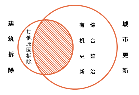 发展阶段不同,城市更新的模式和重点也不相同,三种类型的更新会有所侧重,但又不是完全独立和分割的。早期或特殊时期的城市更新以拆除重建为主,成熟发展时期的城市更新以有机更新和综合整治为主。如果说拆除重建的更新是城市阶段的、粗放式、偏重增量的更新,有机更新和综合整治则是城市永续的、内涵式、偏重质量的更新。因此,建筑拆除与城市更新更像是两个相交的不同大小的圆(图3)。