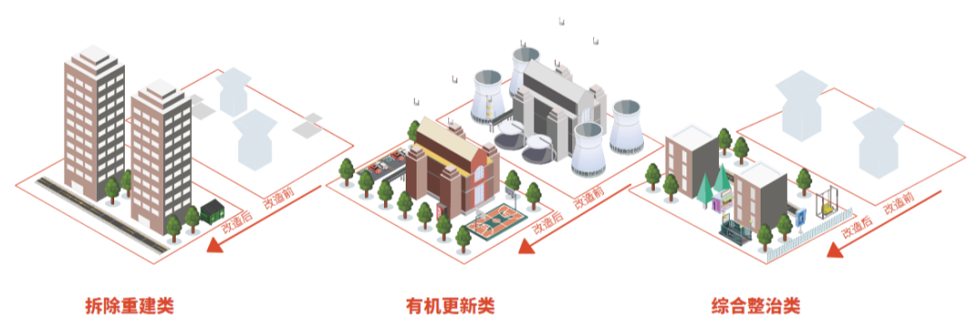 按不同的维度,城市更新会有很多种不同的分类,但无论如何划分,最终都可归为三类:拆除重建类、有机更新类、综合整治类。