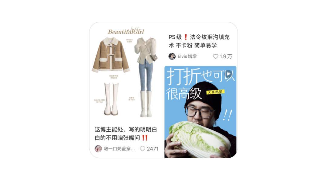 即便是内容卡片巨大的小红书,尺寸跟 banner 差不多,但至少内容卡片能写的字更多,还可以加上头像、昵称和点赞数信息: