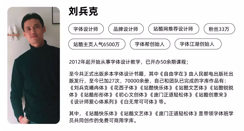 通过训练营2节直播大课+1个作业辅导,即可拥有站酷人气TOP1的刘兵克老师(站酷ID:刘兵克)10年字体设计心得!