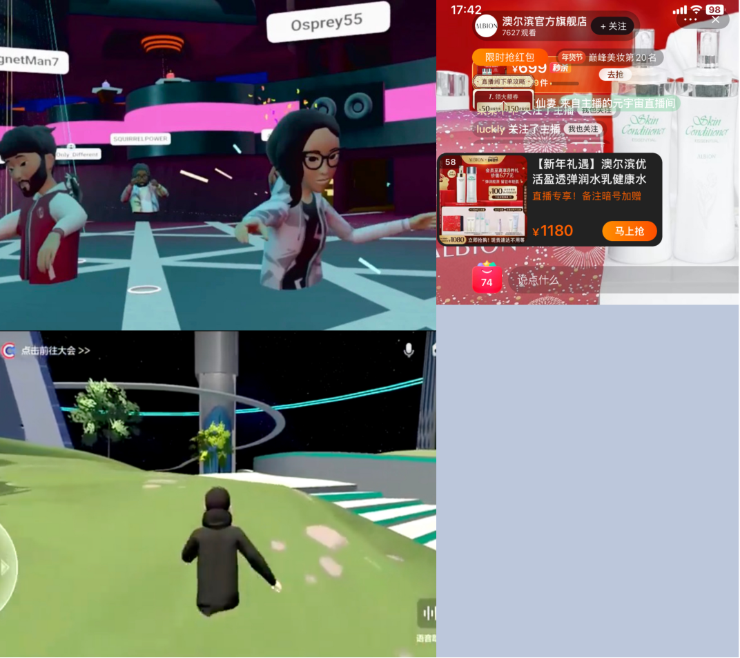 左上为Meta“上半身”飘逸bug;左下为百度希壤的“穿模”;右侧为淘宝未来城跳转bug