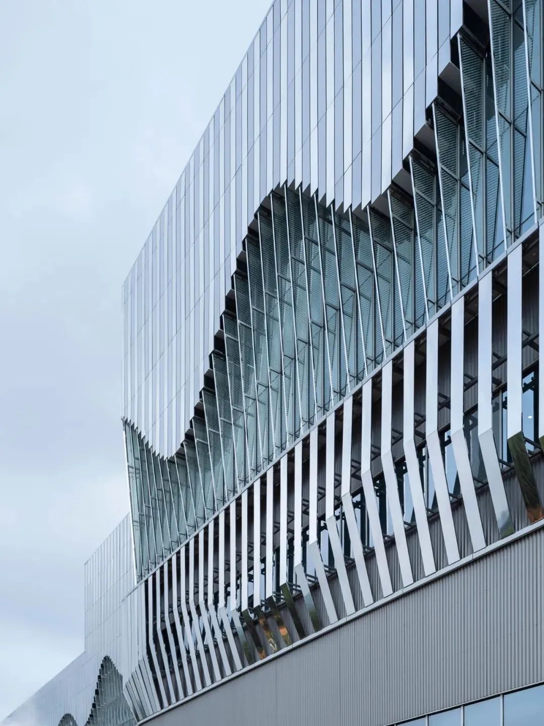 铝板幕墙采用镜面和哑光两种铝板格栅相间布置,形成强反射与弱反射的交替节奏,以条带化的抽象反射将周围环境映衬在建筑表皮之上。参数化的峰丛曲线作为基准线,设定每条格栅的长度,并且通过格栅的单向弯折来实现宏观上的三维曲面效果。这种处理方法有效地降低了工程难度和造价,同时又增加了立面的机械感与构成感,既符合建筑的工业理性,又呼应了建筑的人文属性。