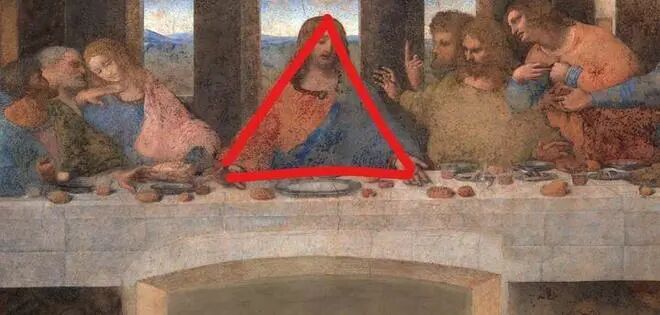 第二个信息,暗喻着基督教的核心教义,圣父、圣子和圣灵三位一体。画中的耶稣披散下的头发连接起了肩膀向下的手臂,平放置在桌面上的双手与肩颈正好形成了一个近乎等边的三角形。