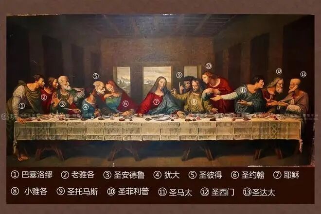 这幅画中总共有13个人,从左到右依次是:巴塞洛缪、老雅各、圣安德鲁、叛徒犹大、圣彼得、圣约翰、耶稣、小雅各、圣托马斯、圣菲利普、圣马太、圣西门、圣达太。