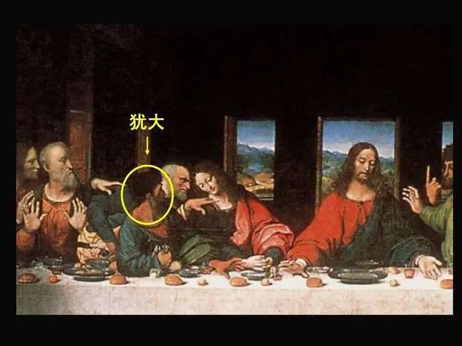 紧接着耶稣的体态分析,我们可以将视线转移到耶稣的手部绘画上来,在耶稣说被人出卖以后并没有直接指明叛徒是谁,但是画作中他的右手则告诉了我们答案——犹大。