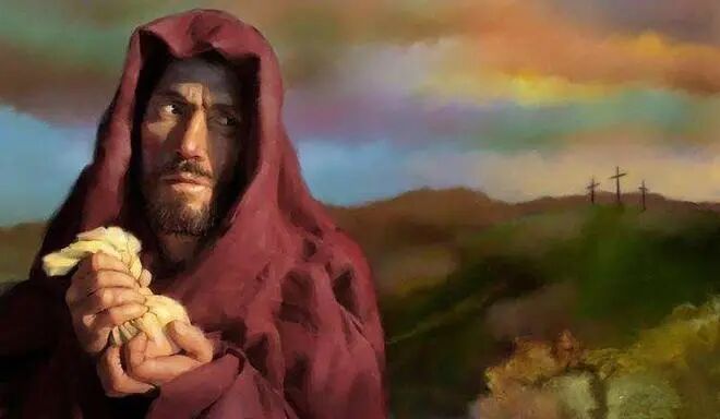 在逾越节那天,耶稣忧郁地告诉他的12个门徒:“我实话告诉你们,你们中有一个人出卖我了!”晚餐以后,耶稣就被抓走并被钉上了十字架。
