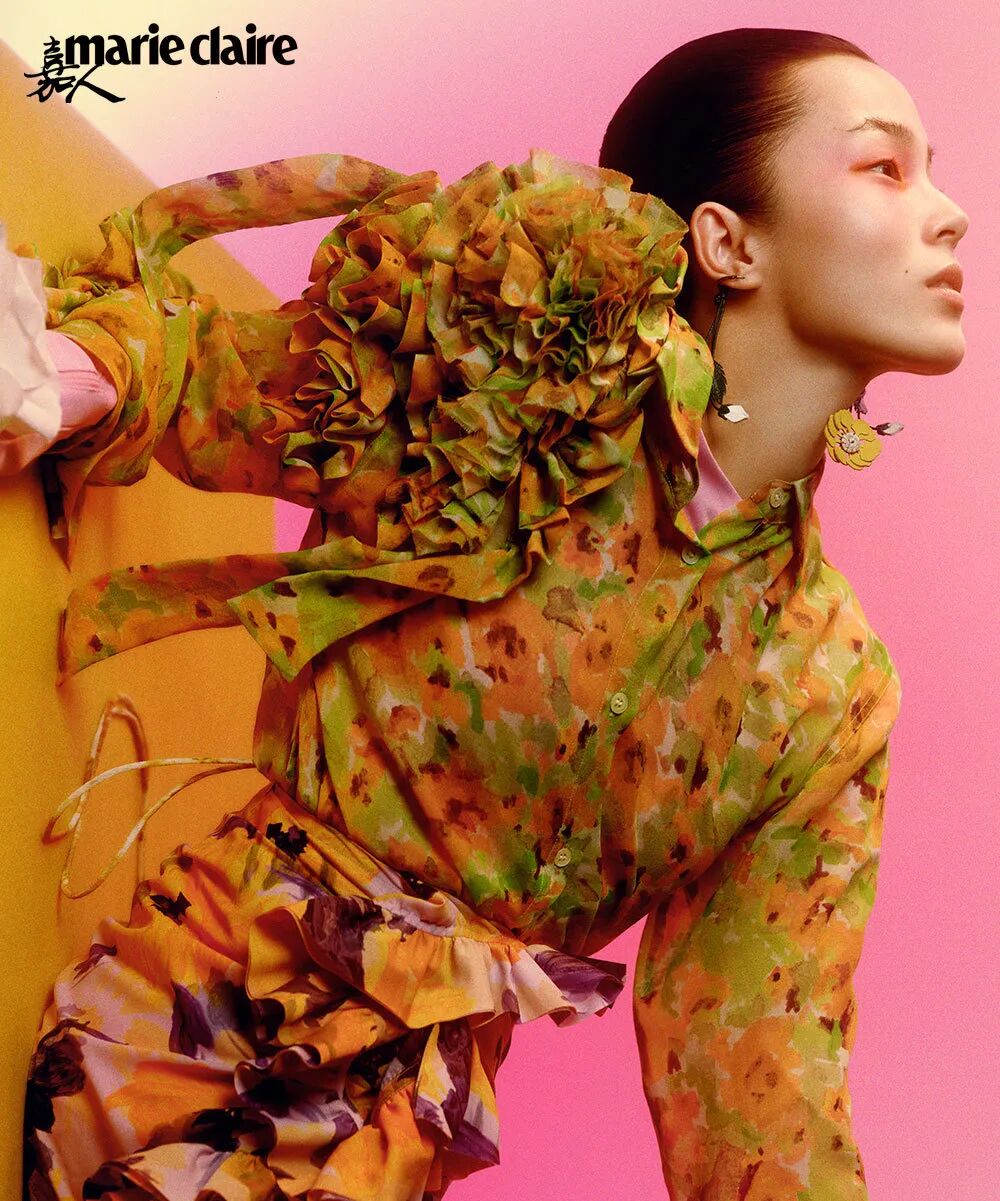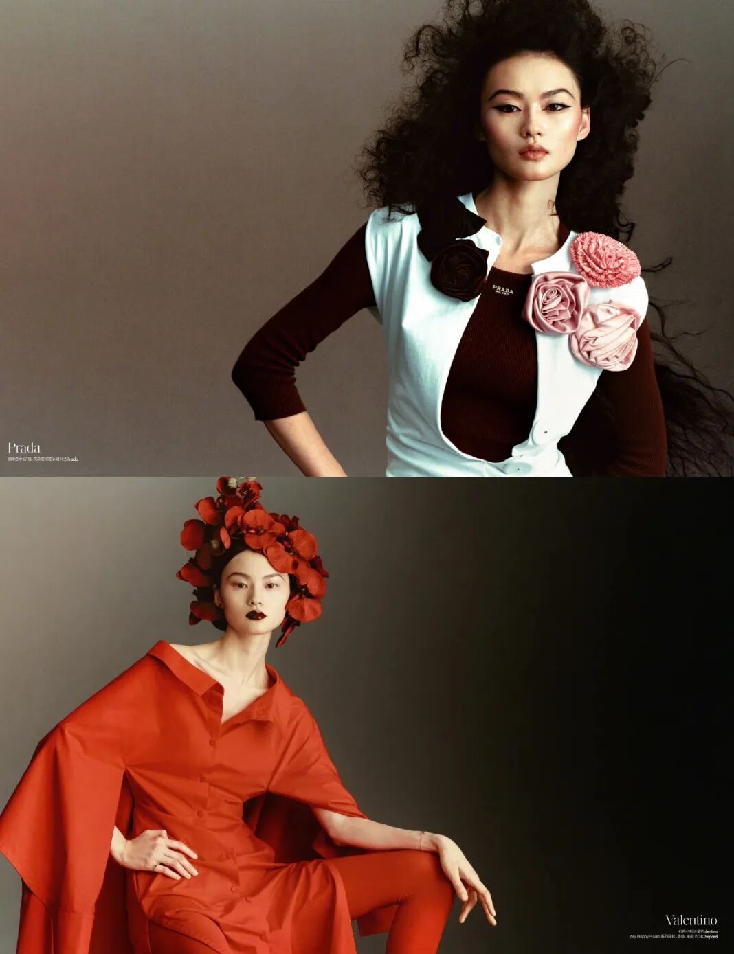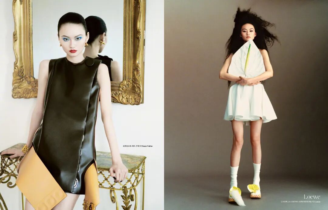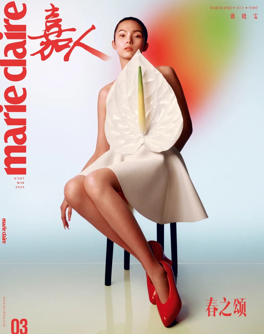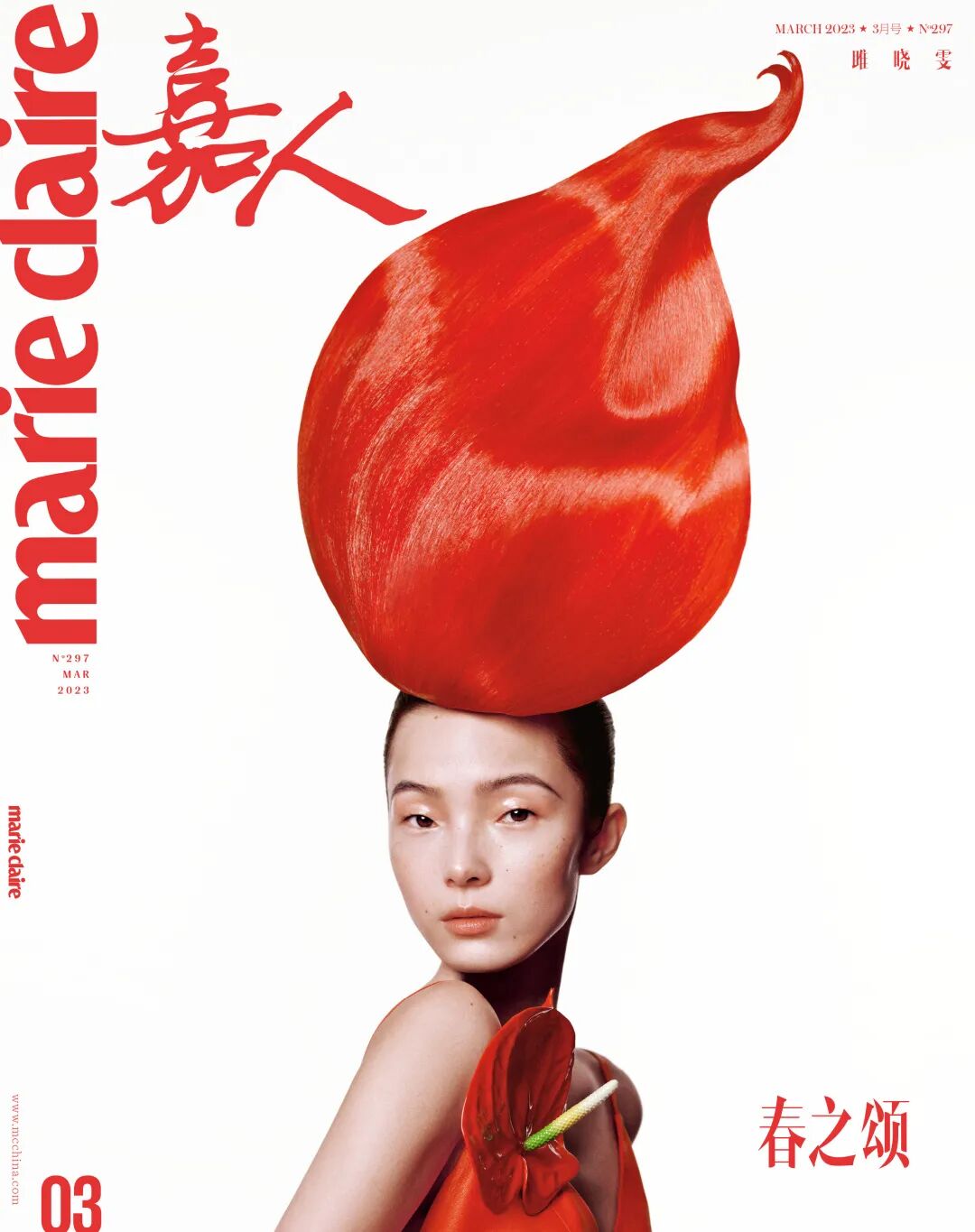 超模雎晓雯身着 LOEWE 红白掌花连衣裙登上《嘉人》三月开季刊双封面,不得不夸一下,嘉人的时装大片水平总是那么突出!