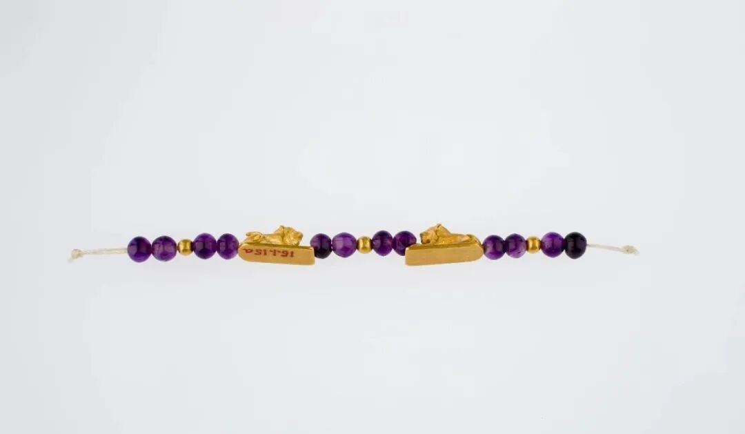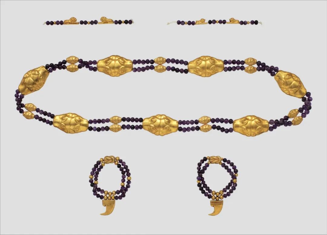 上图这组珠宝,出土于公元前1887年到公元前1813年的埃及王室墓葬,是一位古埃及公主随葬珠宝中的一部分。这套珠宝包括一条项链、两条手链和两条脚链,均以紫水晶珠、金珠以及金质挂坠组成,制作极其精美。就算是在几千年后的现代,依旧可以看出紫水晶的通透感。