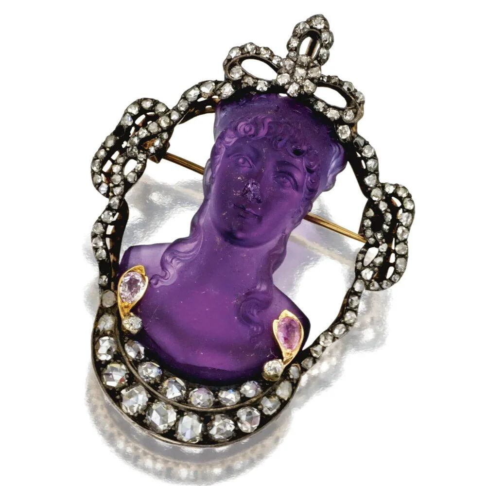 这套紫水晶套装最初属于维多利亚女王的母亲——肯特公爵夫人,后来传给了维多利亚女王。1901年的英国王室珠宝清单中记载着,这套紫水晶套装包含了一条项链、一对梳子、一对耳环和三枚胸针。
