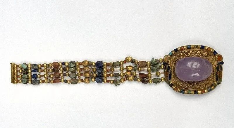 在距今3000多年前的图坦卡蒙墓中,发现了上图这条紫水晶圣甲虫手镯。手镯的带子由四串金珠子、玛瑙、天青石和碧玉组成,形状是荷鲁斯和圣甲虫的小眼睛。