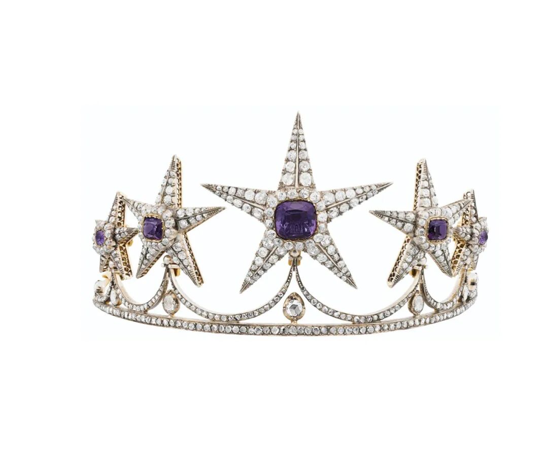 这套紫水晶套装原本有一条项链、两条手链、耳环、以及两枚胸针,最初属于拿破仑的第一任皇后约瑟芬,历经数代传承后,作为陪嫁进入瑞典王室。1976年,瑞典王后西尔维娅将项链改为了头饰,手链改为了项链。