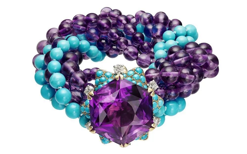 设计师将约300颗宝石圆珠串成细链缠绕,并在搭扣中央镶嵌一颗六角形切割紫水晶,周围延伸出6颗绿松石,如同一颗明亮的六芒星。