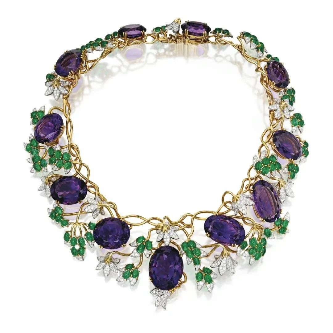 1953年,公爵夫人首次佩戴这条惊艳的紫水晶项链亮相凡尔赛宫晚宴。当晚她身着的一席抹胸礼服,完美凸显了项链的印第安风格以及彩色宝石与黄金的精妙搭配。1986年公爵夫人去世后,这条项链于1987年在日内瓦苏富比拍卖会上以60.5万美元(约375万人民币)的价格售出。