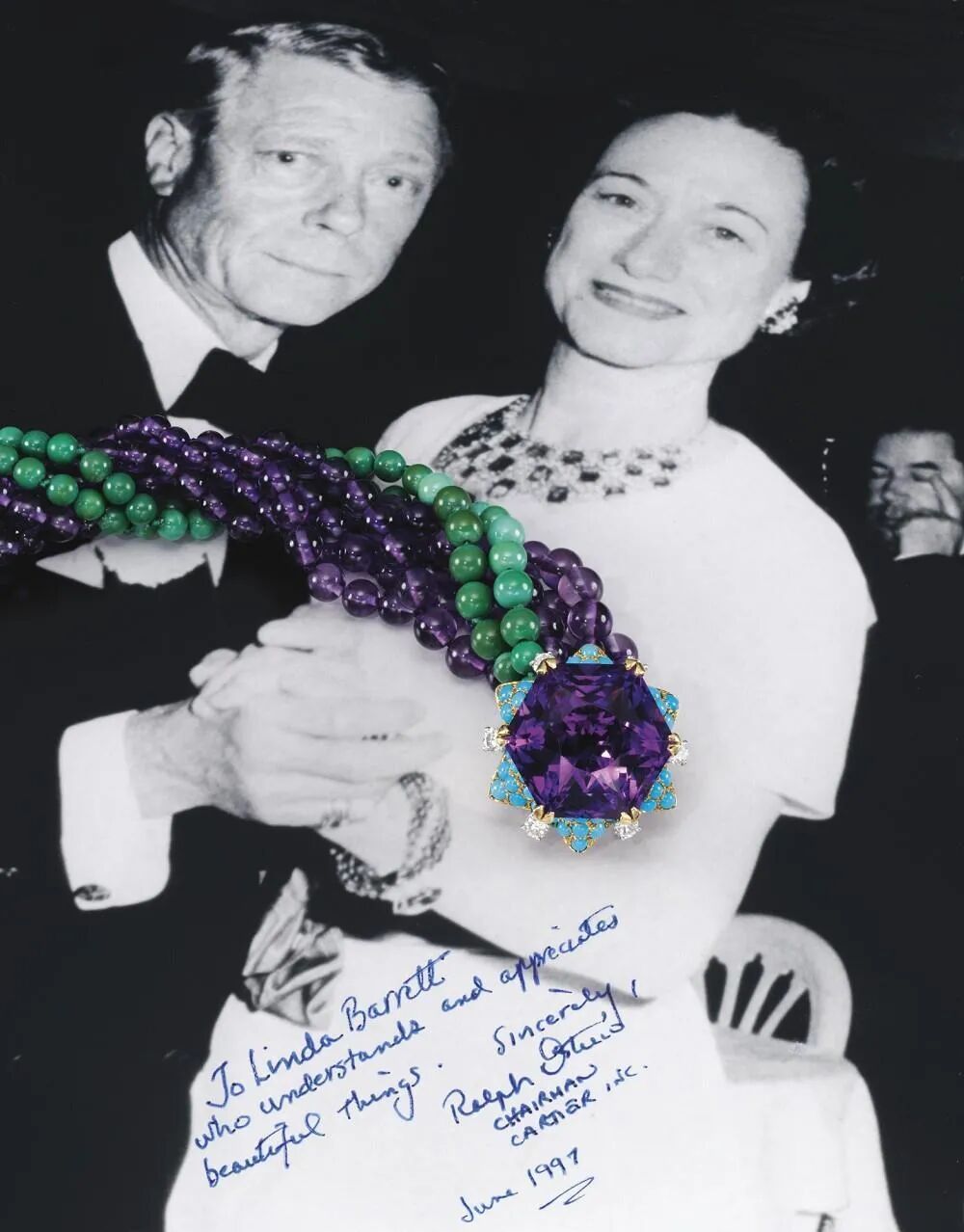 1947年,温莎公爵夫人收到了一件特别的珠宝——来自卡地亚的紫水晶项链。