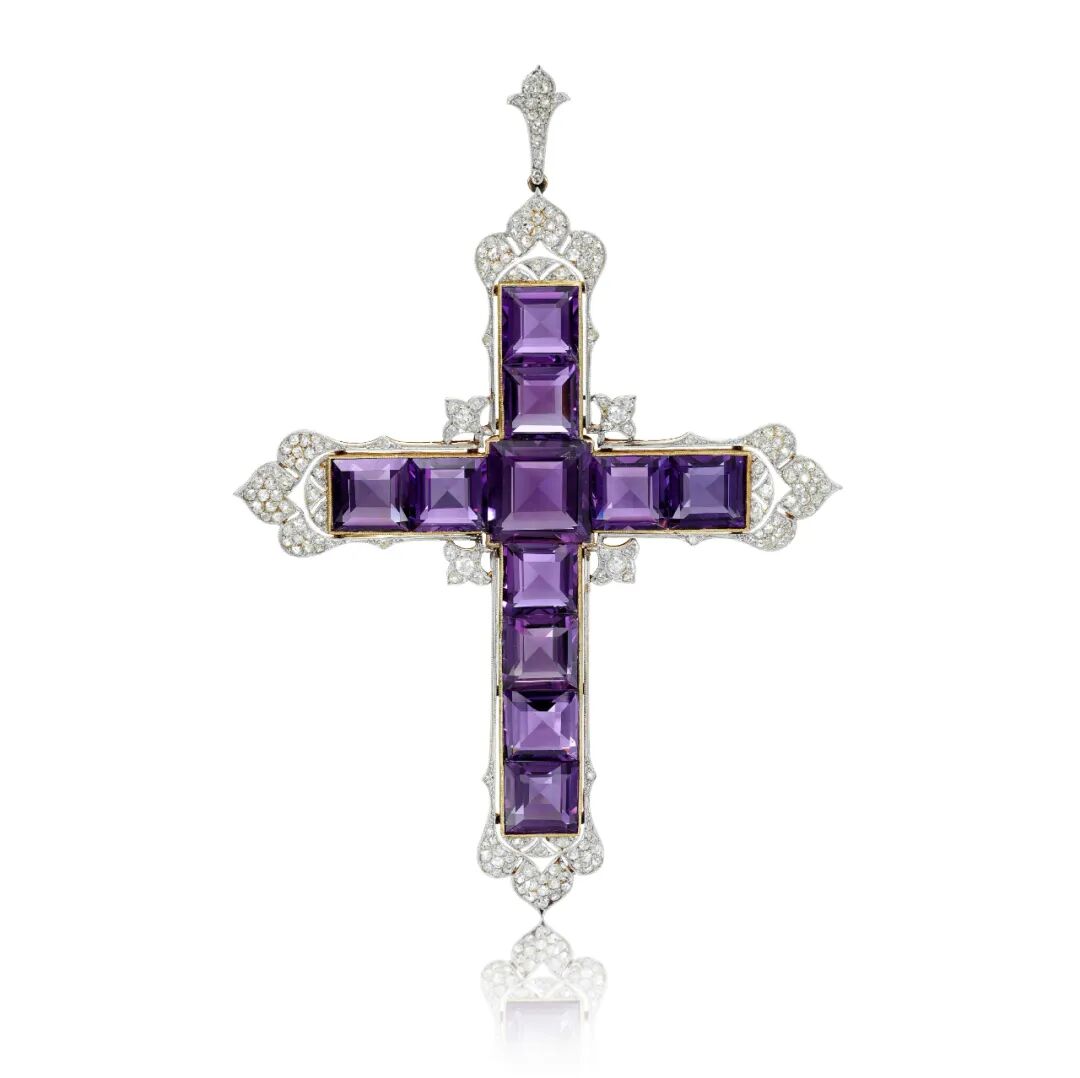 这枚名为Garrard Attallah 的紫水晶吊坠,由英国老牌珠宝商杰拉德制作于20世纪初,上面镶嵌着11颗方形紫水晶,十字架顶端用圆钻勾勒出花型装饰图腾,风格华丽而精致,整体十分庞大。