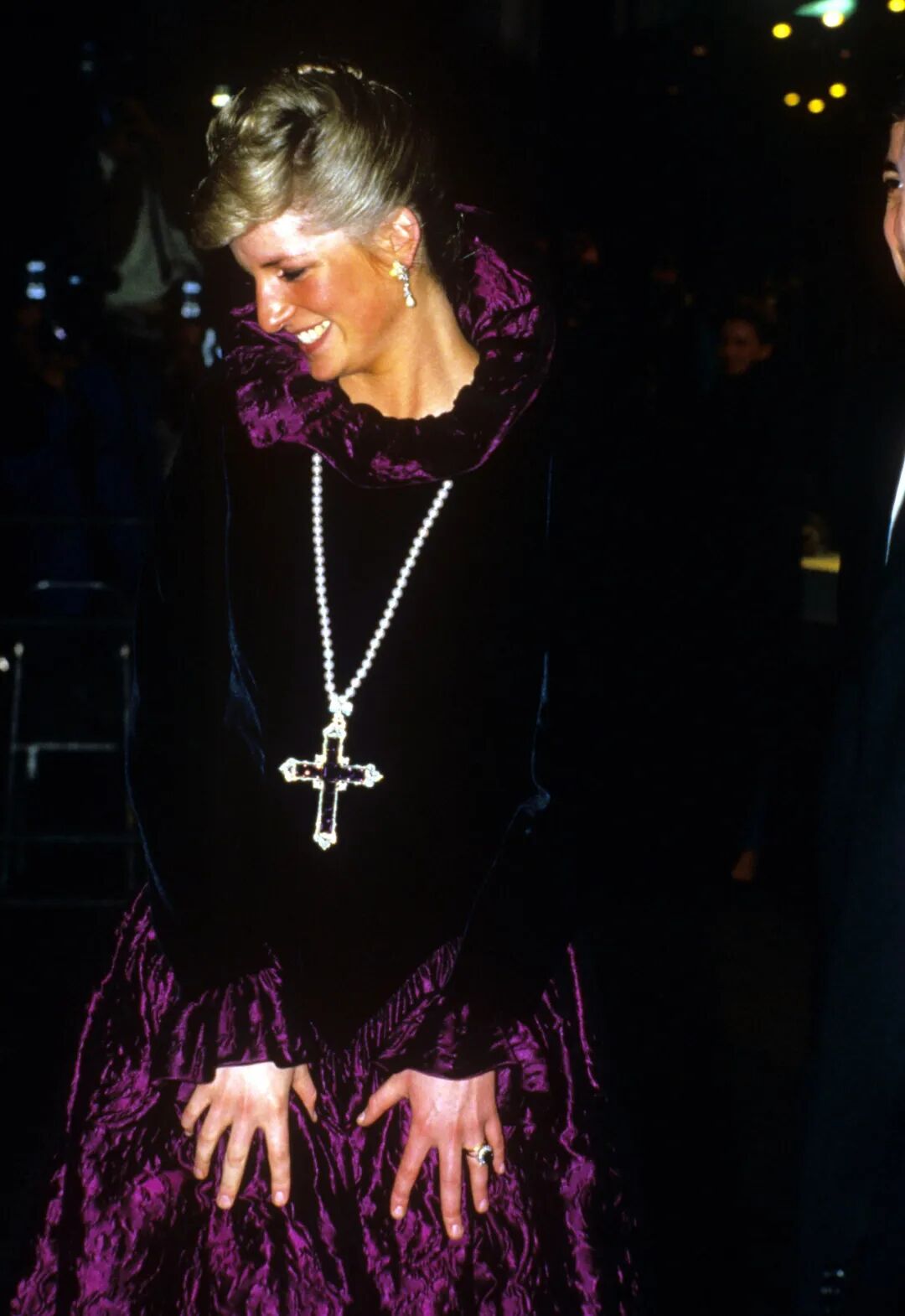 这枚紫水晶吊坠最高光的时刻,要数1987年戴安娜王妃出席慈善晚宴时的装扮。她将这枚吊坠挂在一条长排珍珠项链上,搭配精致的巴洛克风格紫色天鹅绒连衣裙,华丽又俏皮的风格令在场人士惊艳不已。