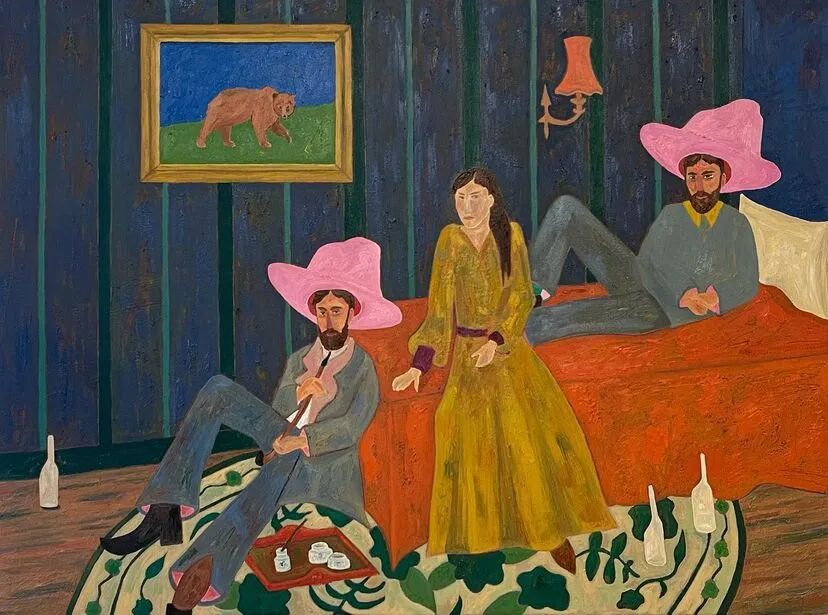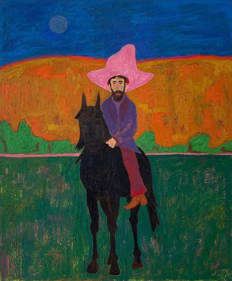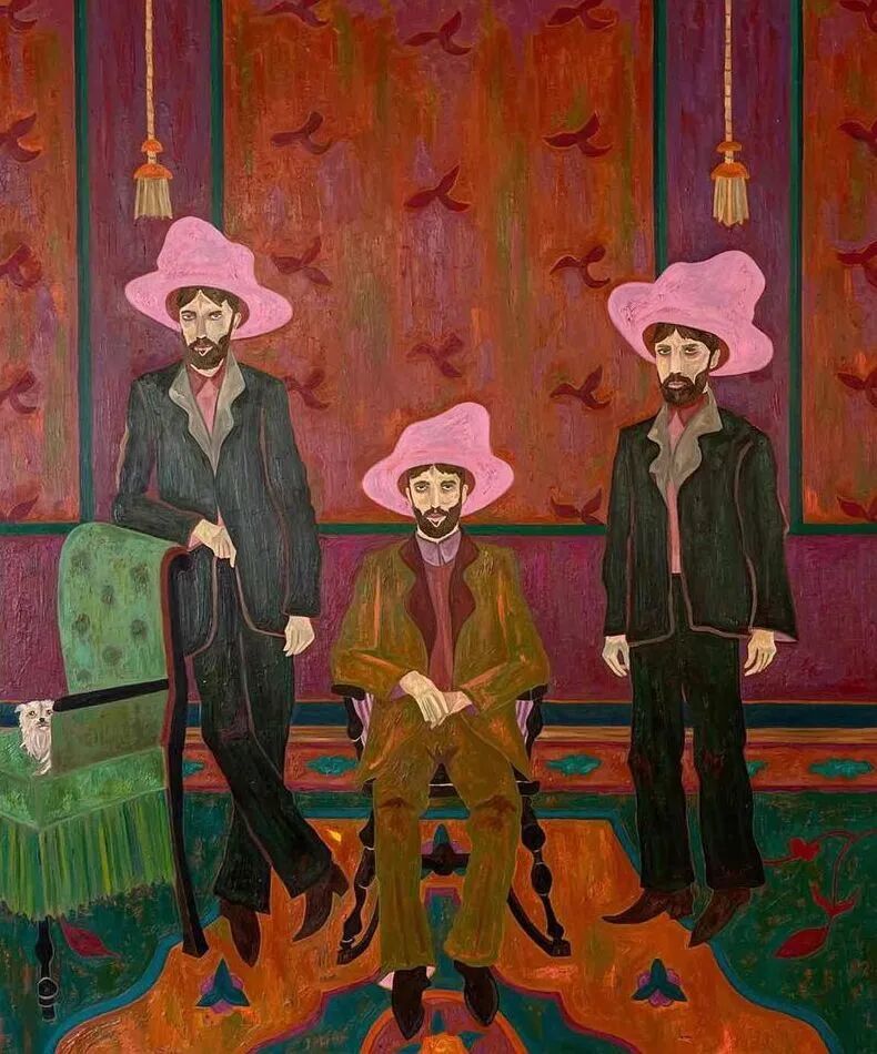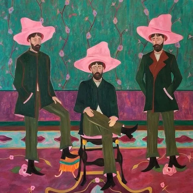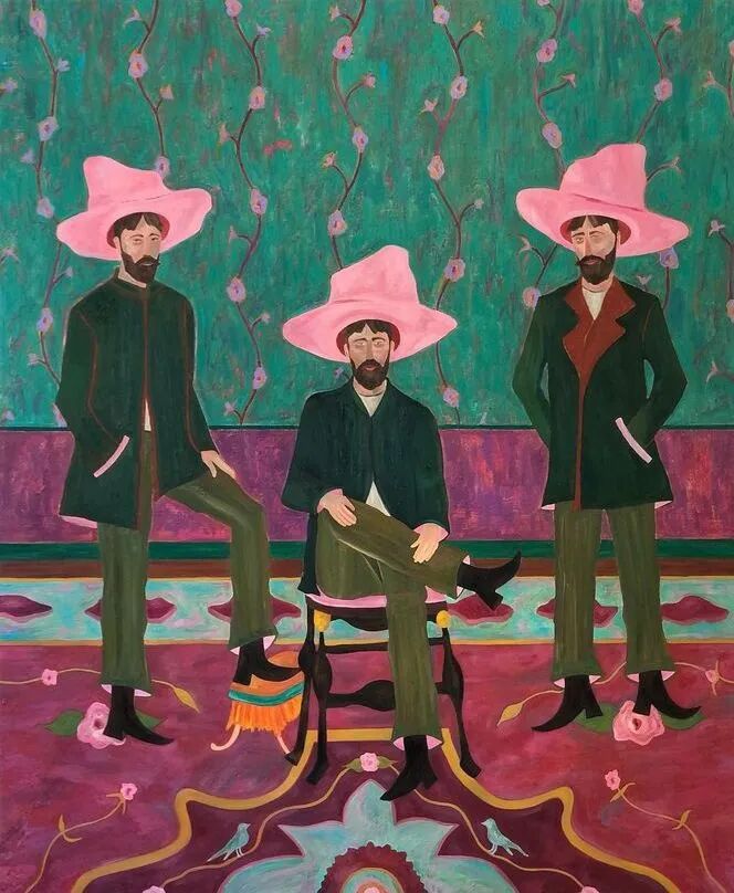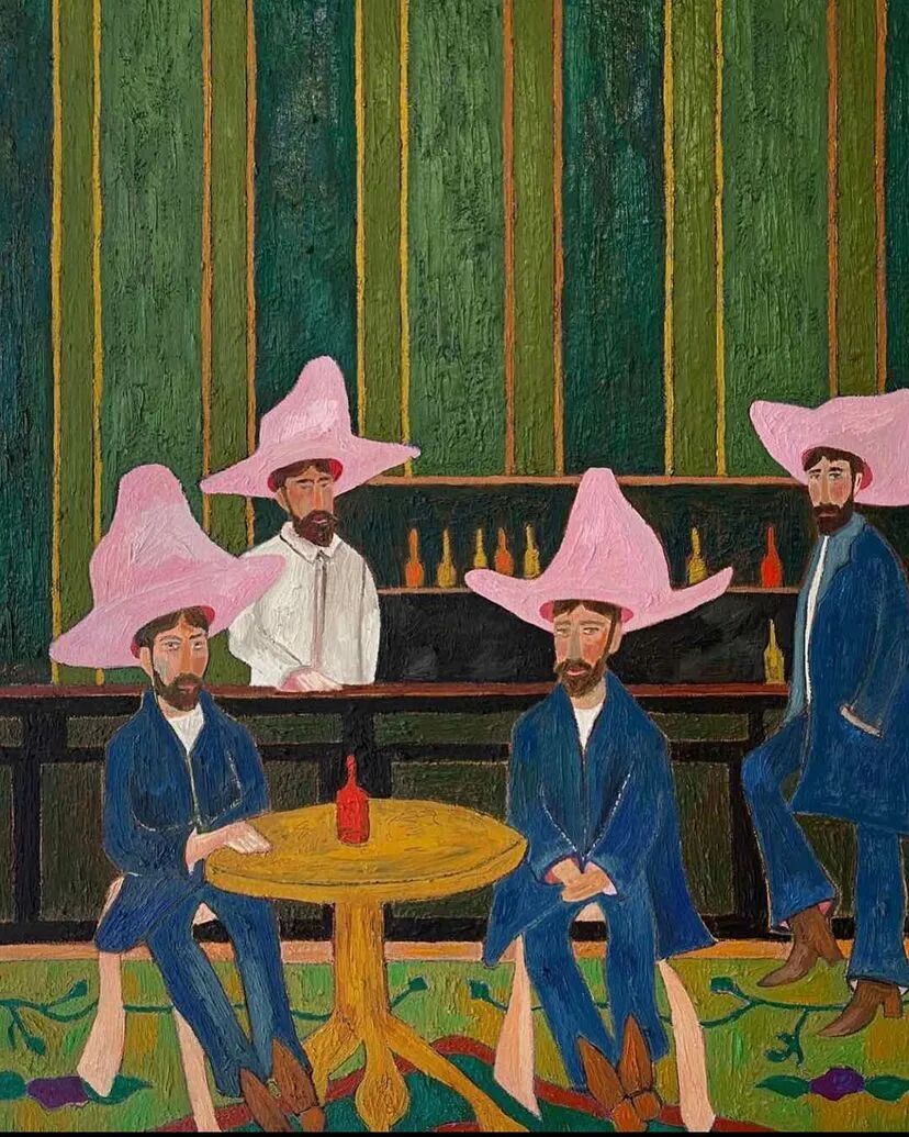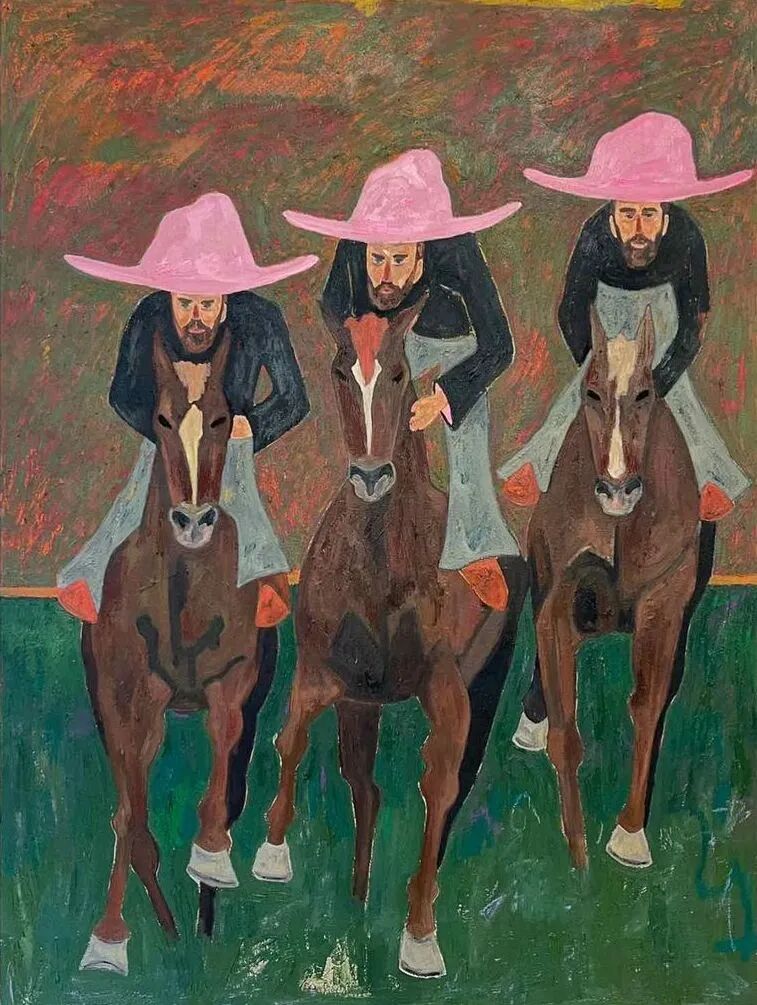 Ben Crase作品描绘充满乐观和幽默感的19世纪美国西部的人物和场景,画中的男性都戴着大得离谱的粉红色帽子。他试图用颜色、质地和不合时宜的构图选择能引起观众的情感反应,让人意识到西部不那么完美的过去。