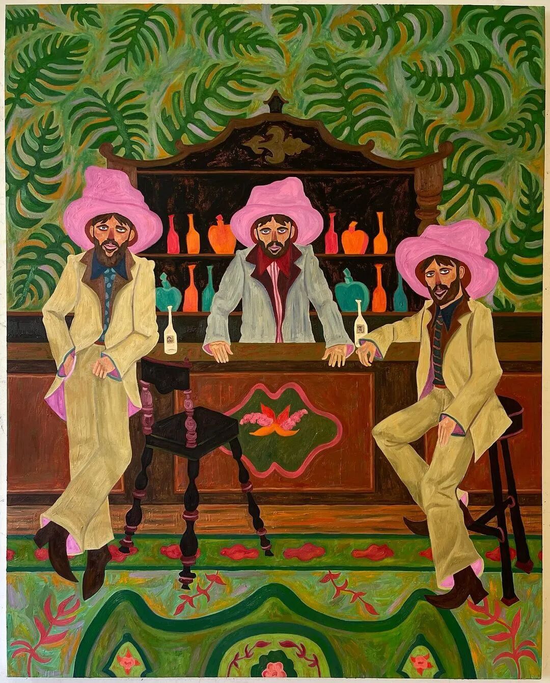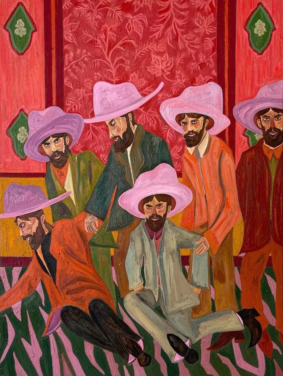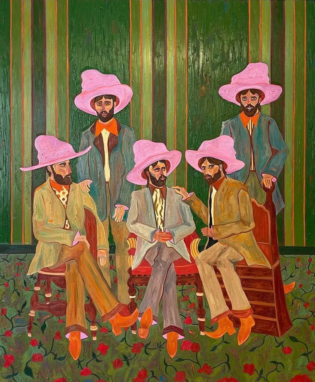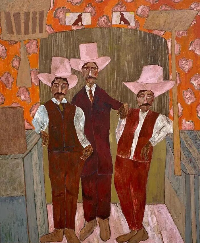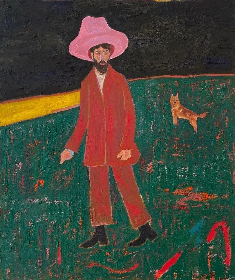 Ben Crase作品描绘充满乐观和幽默感的19世纪美国西部的人物和场景,画中的男性都戴着大得离谱的粉红色帽子。他试图用颜色、质地和不合时宜的构图选择能引起观众的情感反应,让人意识到西部不那么完美的过去。