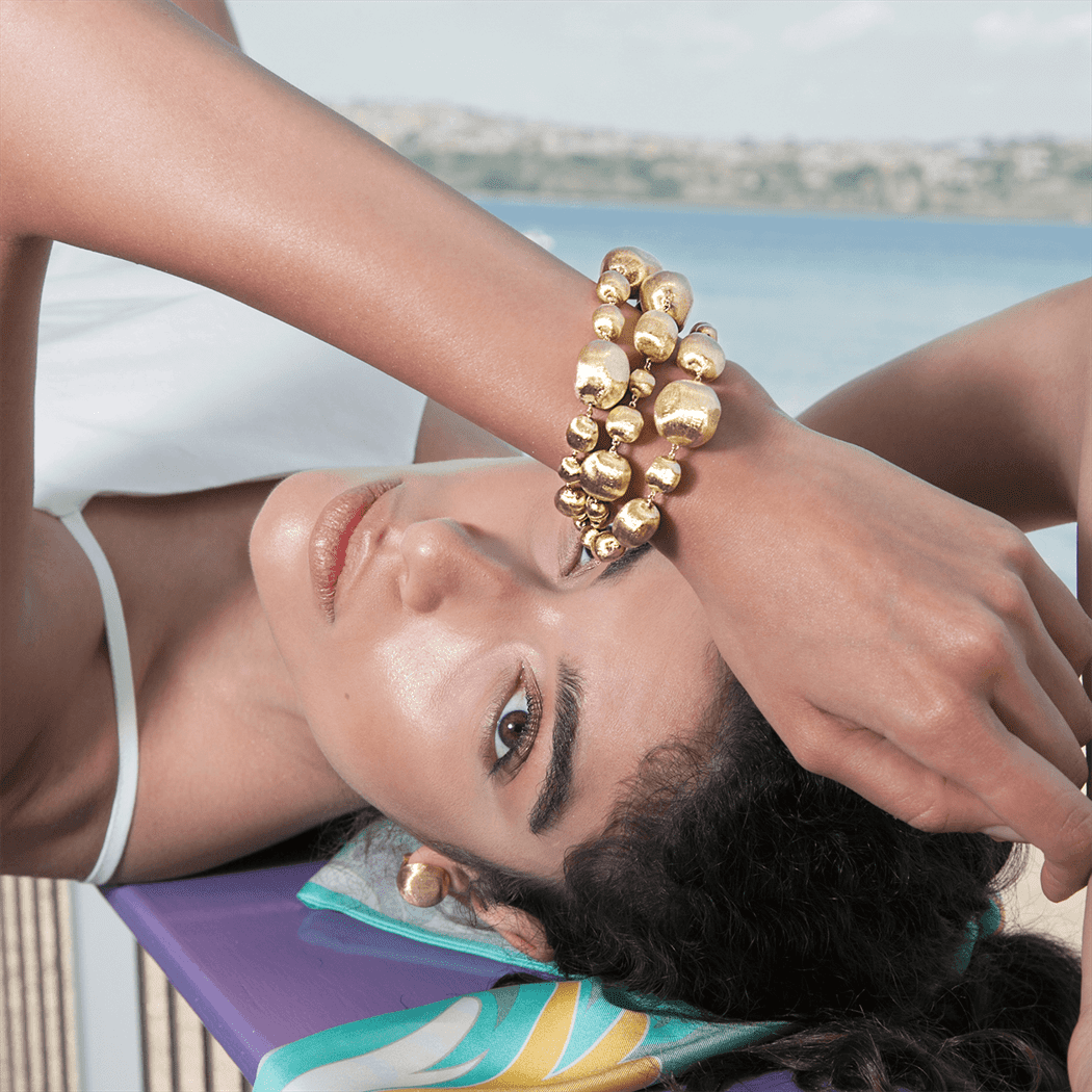 MARCO BICEGO 有很多系列,我的party之选是神秘且华丽的Africa。其灵感来自撒哈拉沙漠中的柔软沙丘及传统部落饰物,手工圆形金珠串连,18K金色球体表面以手工雕刻出细腻纹路,纹路清晰可见,形态不一。
