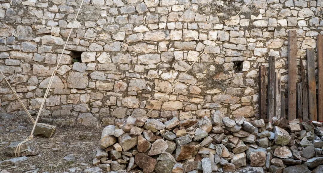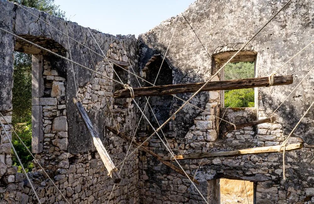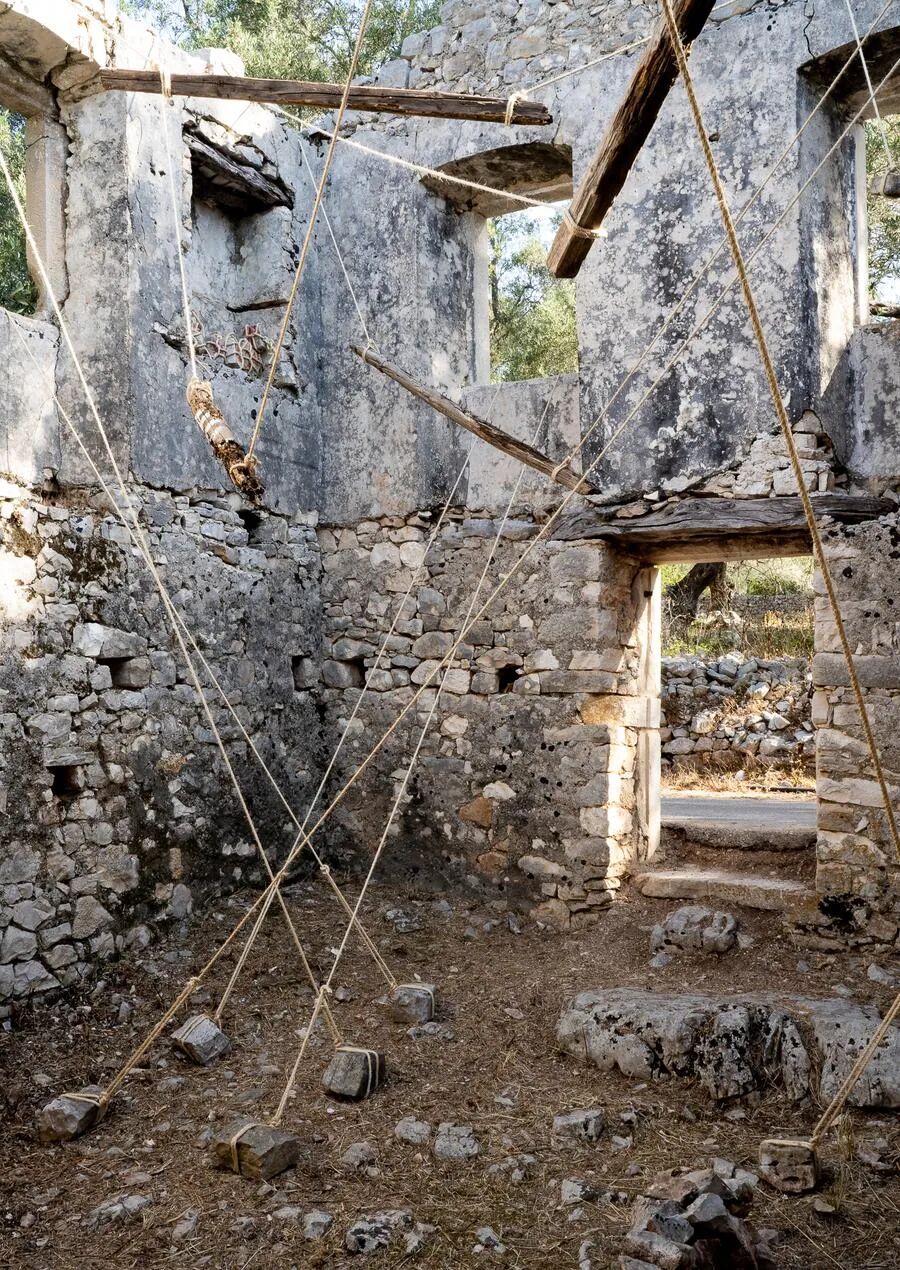 此行他们受到帕克索斯传统建筑技术和文化仪式的启发,该装置探索了平衡状态,具体化为一个编织的绳索网络,悬挂在摇摇欲坠的石头结构上,将木梁悬挂在空中。