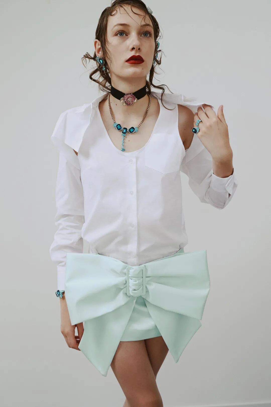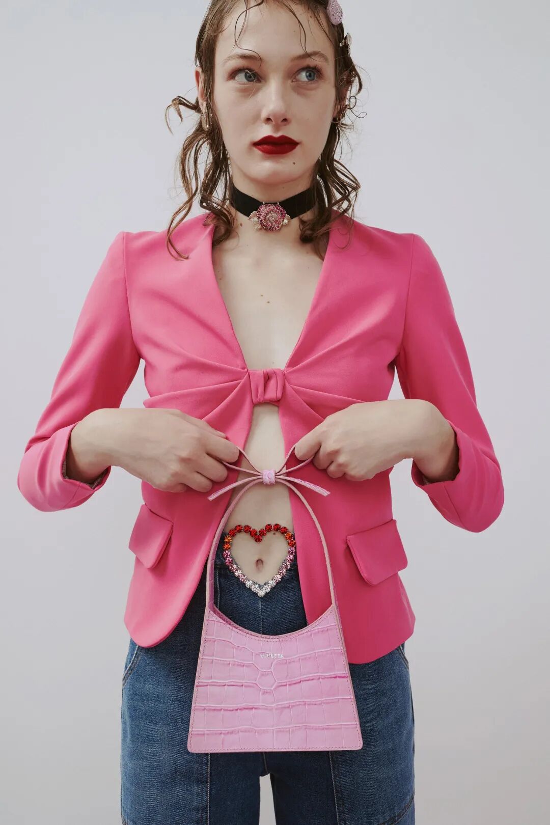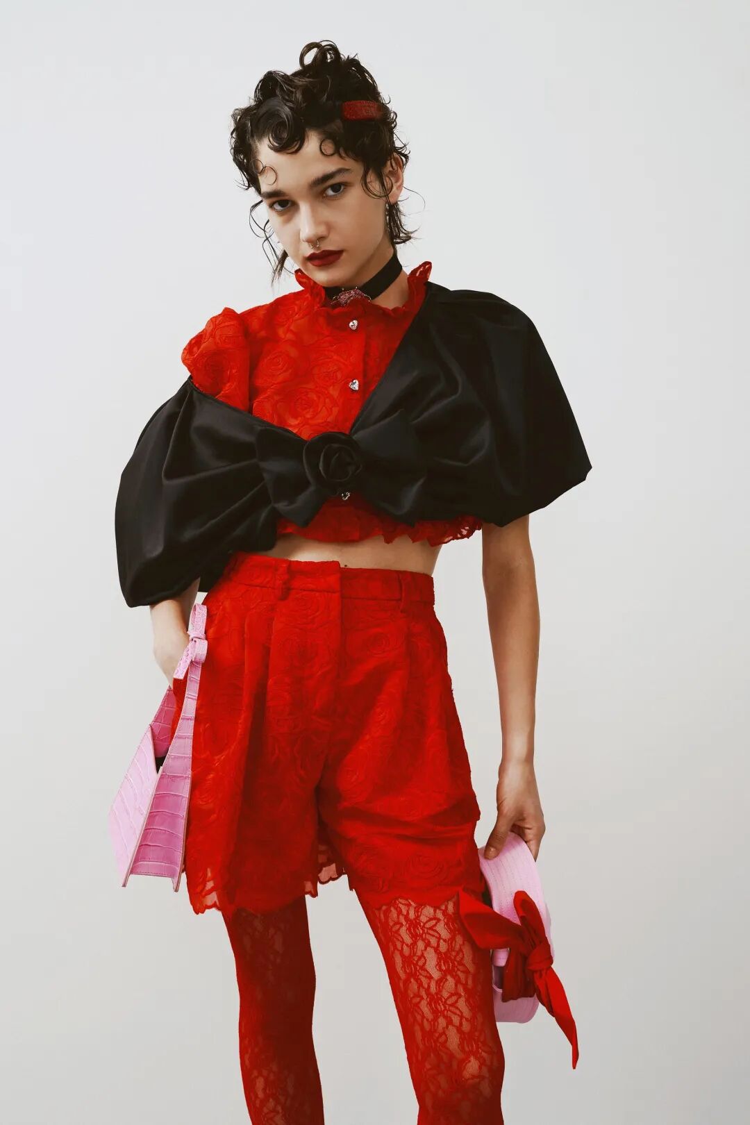 立体的蝴蝶结、娇嫩的玫瑰、镂空的爱心都表达着少女的萌动与俏皮,古典浪漫主义的风格让人一眼就猜到了是Vivetta Ponti的设计。