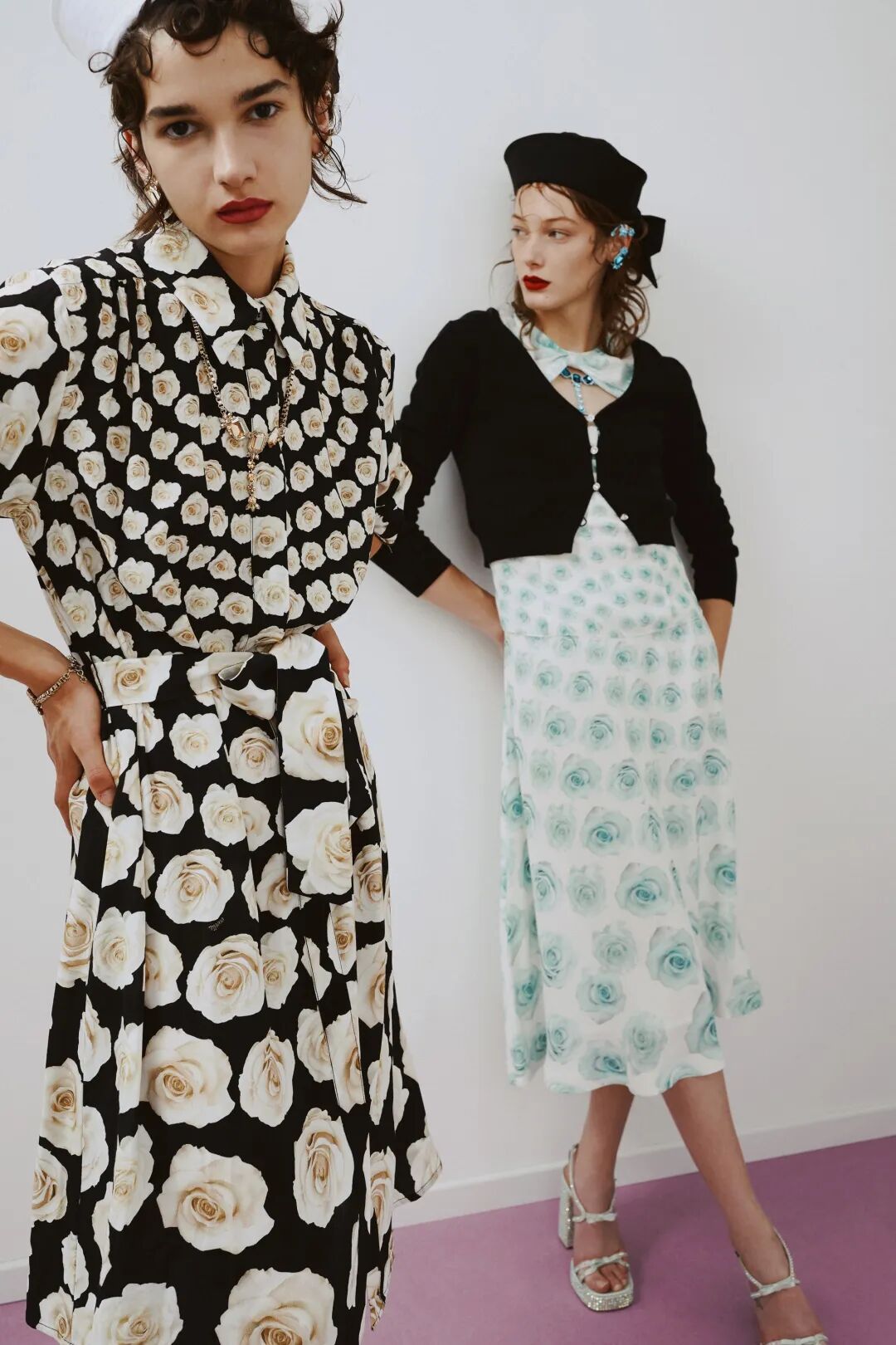 女性化的50年代无袖连衣裙、宽大的印着玫瑰上衣、胸前有巨大蝴蝶结的超短迷你裙、浪漫的带有蕾丝花边的上衣、轻薄的府绸分层背心裙,都营造出夏日清新的感觉。