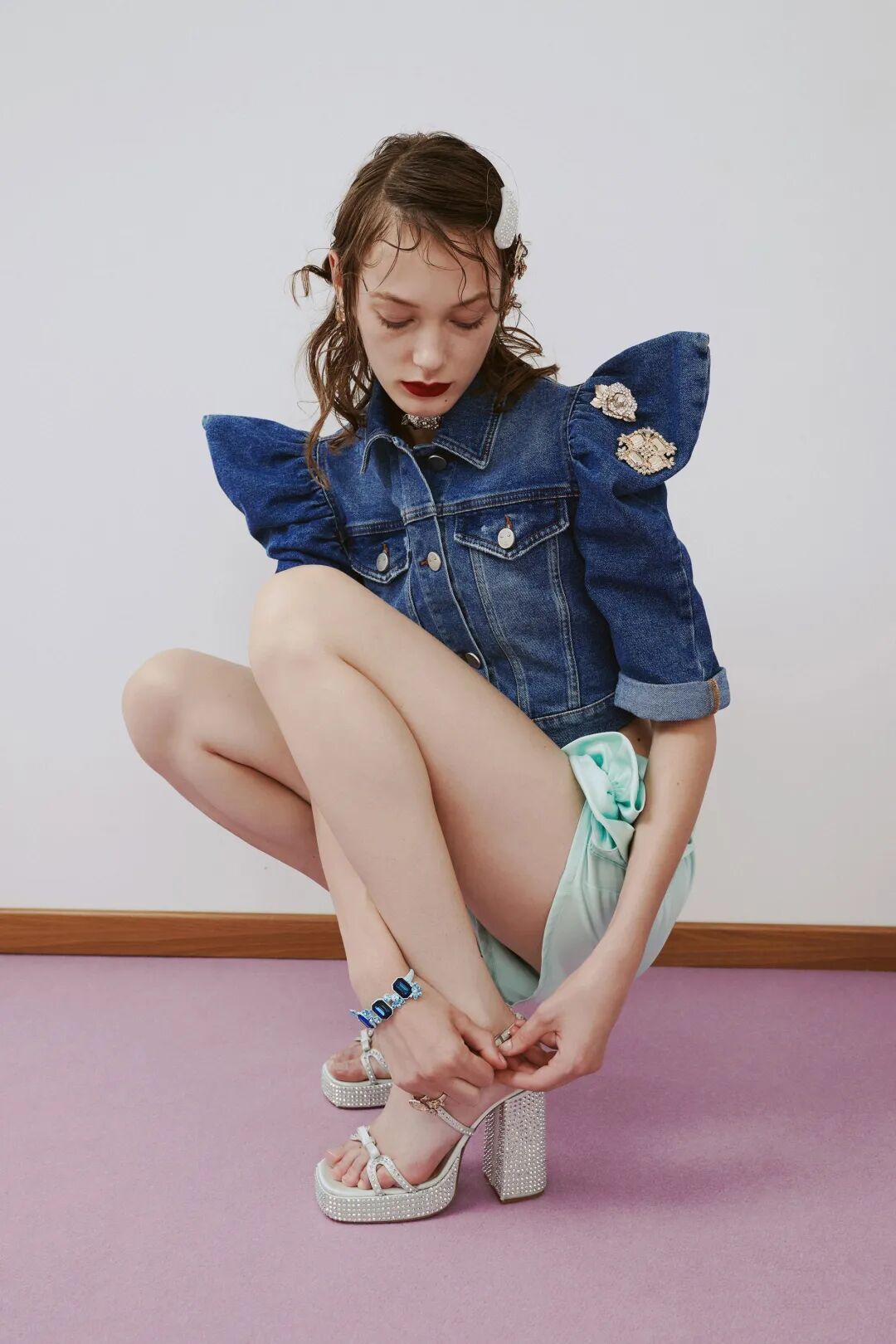 少女们站在闪闪发光的高台上,脚上心形镂空的及膝长靴装饰着这份闪耀,隔着屏幕都能感受到Vivetta Ponti传递的那份可爱与俏皮。