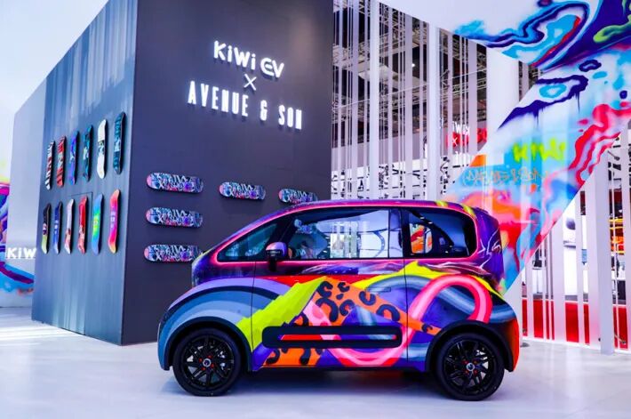但不同的是,KiWi EV联名知名滑板品牌、涂鸦艺术家,光是在外观上就呈现出标新立异的设计;甚至和大疆、苏宁、阿里巴巴都有跨界联名,更能看出这款车在潮流科技化方面的决心。