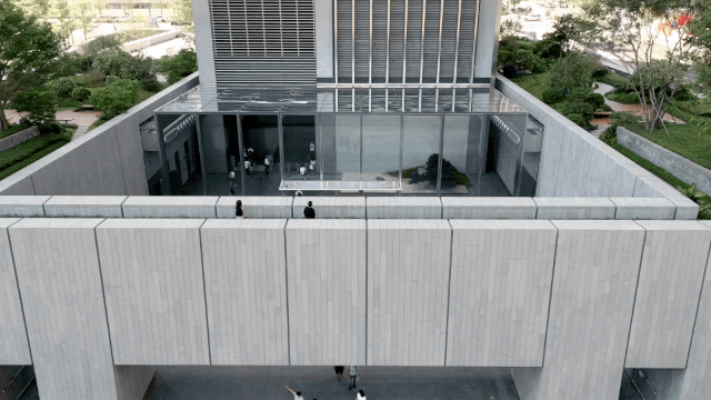 从裙楼底部走进半开放的「庭院空间」,这里成为城市与办公大楼的空间过渡。