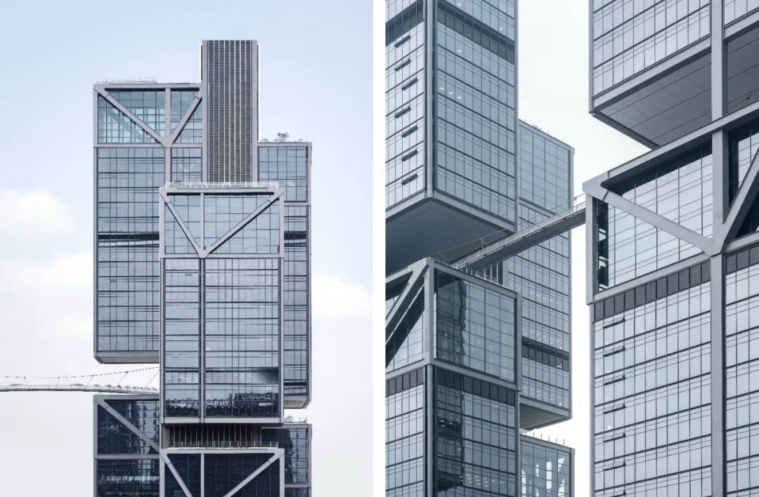 如果说塔楼像树一样向上延展,那这“玻璃体块”便如同树叶般依附在枝干上。东西两塔合计十二个“玻璃体块”参差不一,成就了独特的“非对称大悬挑”钢结构体系。