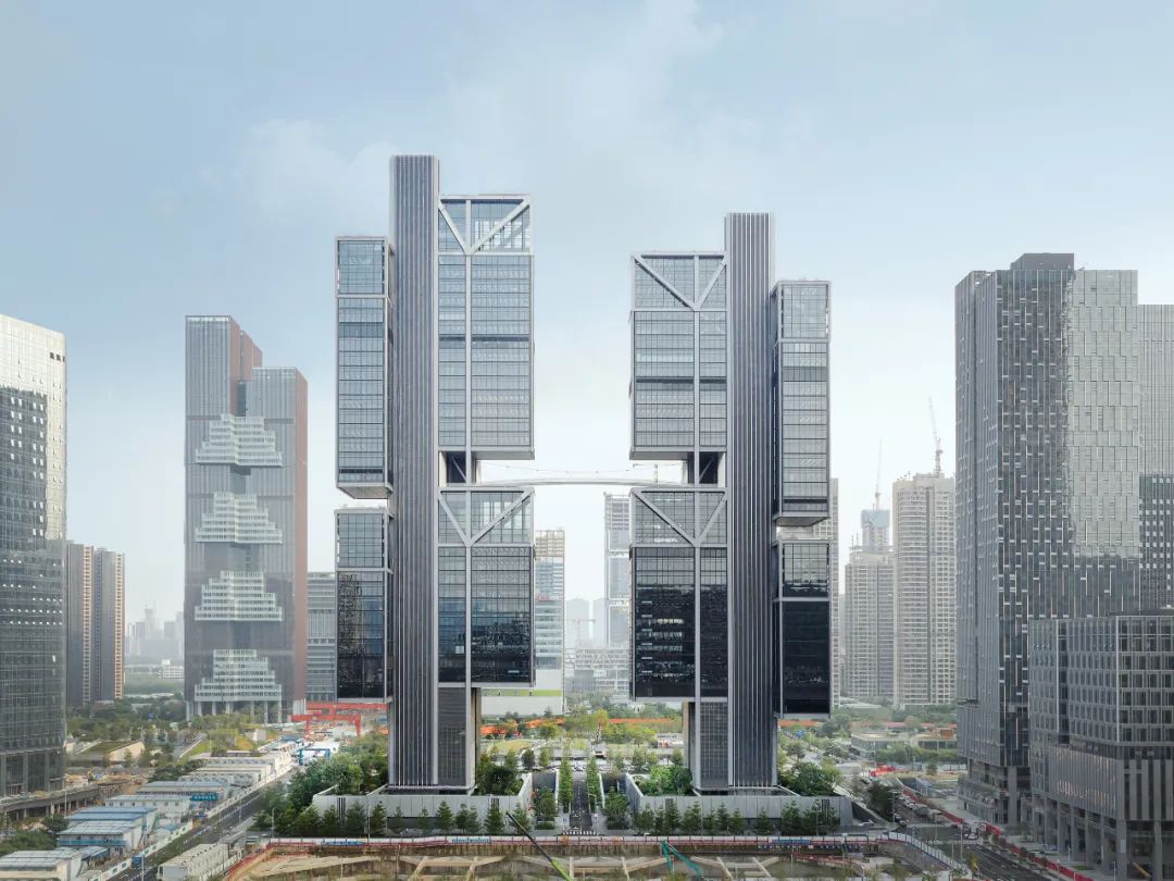建筑最大的难度挑战就是如何将办公区域“稳固的附着”在落地的核心筒上。每个塔楼上悬挂的6个功能体块极大增加了核心筒的“压力”,不仅需要承担的重量增加了,抗震和抗风的需求也增加了。