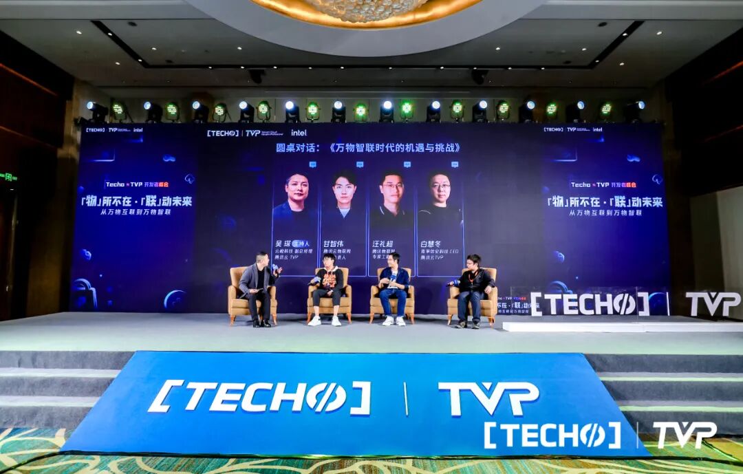 演讲过后,便进入到思想火花碰撞的圆桌论坛,以“万物智联时代的机遇与挑战”为主题,此次论坛由云检科技副总经理、腾讯云TVP吴琛主持,腾讯云物联网产品负责人甘智伟、腾讯物联网专家工程师汪礼超、青寕信安科技CEO、腾讯云TVP白慧冬齐聚一堂,展开了精彩的交流。