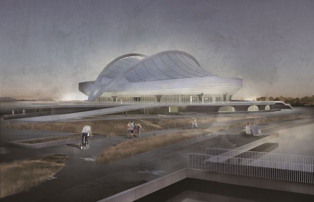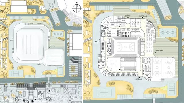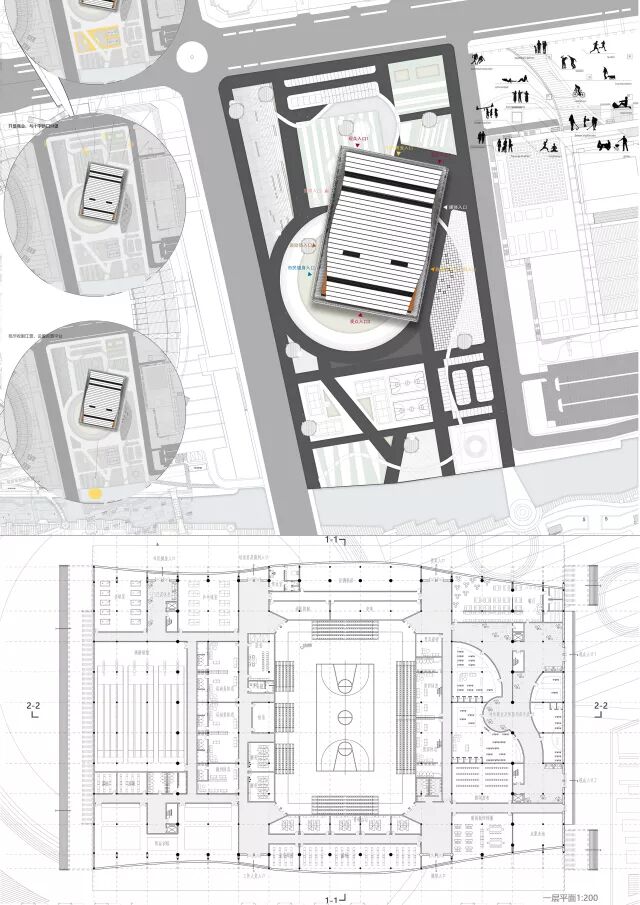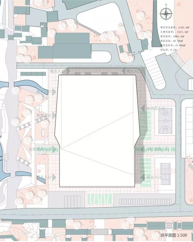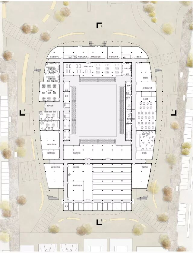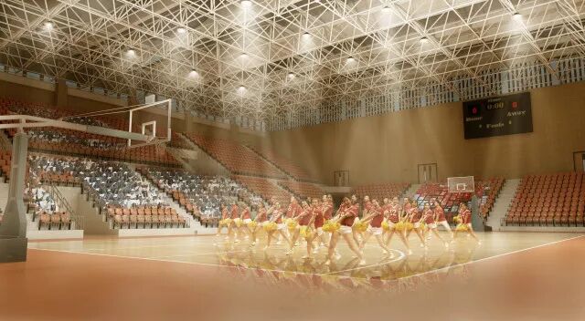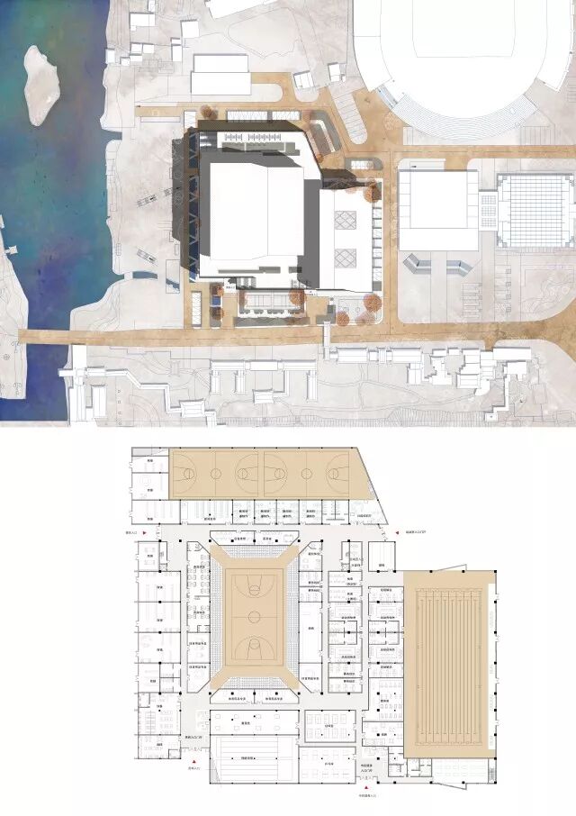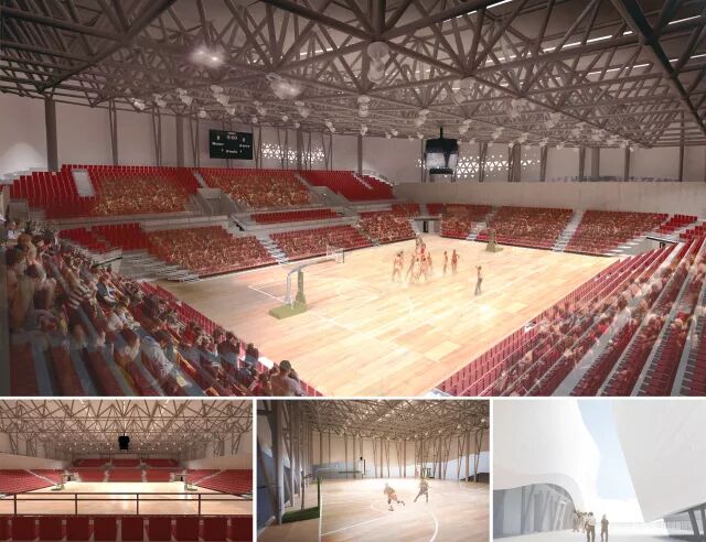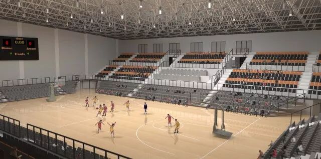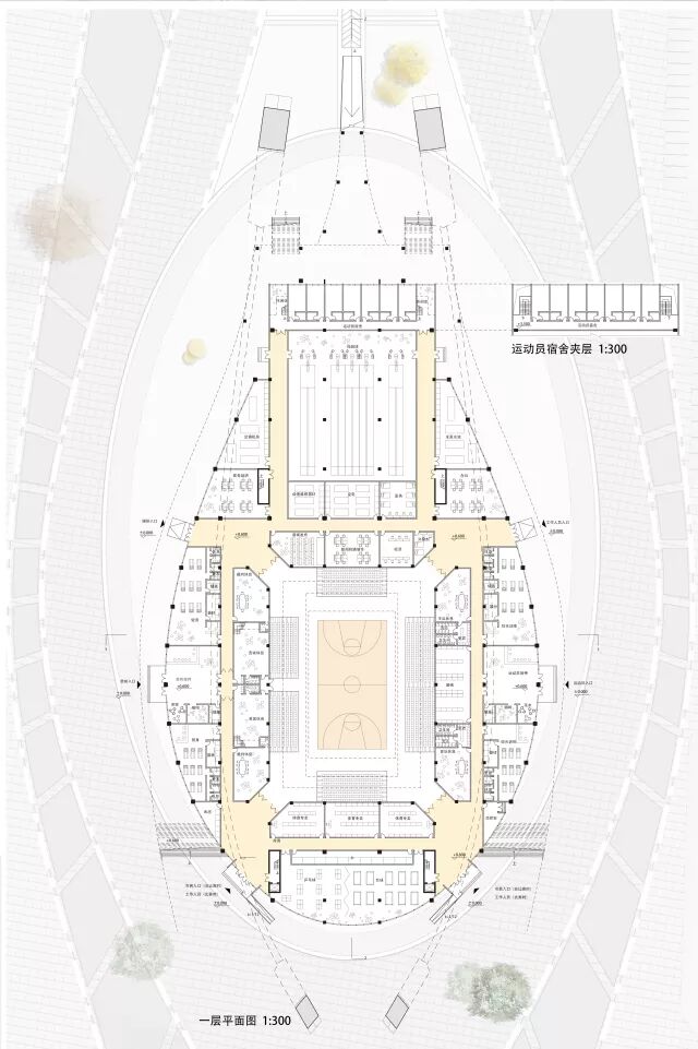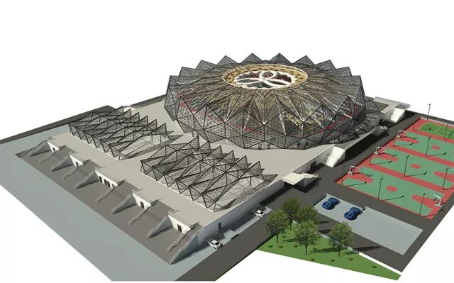 设计中型体育馆,同时容纳职业体育比赛及群众健身功能。功能涵盖5000座体操场(或2500余座手球场、600余座游泳馆),双篮球场训练场地,其他体育活动场地以及配套服务用房和室外活动场地。总建筑面积<16000㎡。