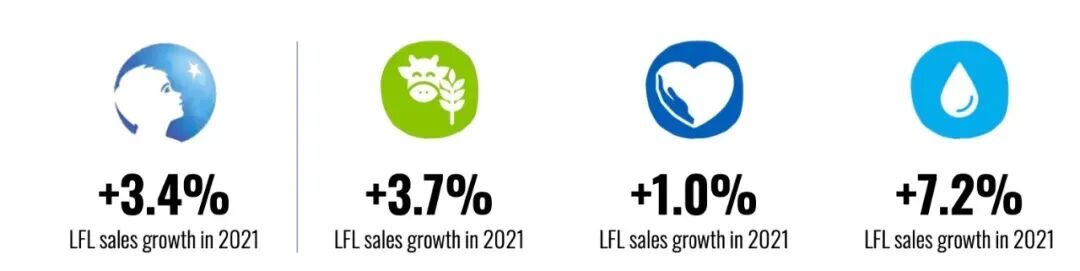 剩下两大板块的成绩同样较为可观:2021年,达能基础乳制品和植物基产品销售收入为131亿欧元,同比增长3.7%。四季度,销售收入同比增长了4.3%;饮用水和饮料业务2021年销售收入为40亿欧元,同比增长7.2%。四季度,销售收入同比增长17.3%。