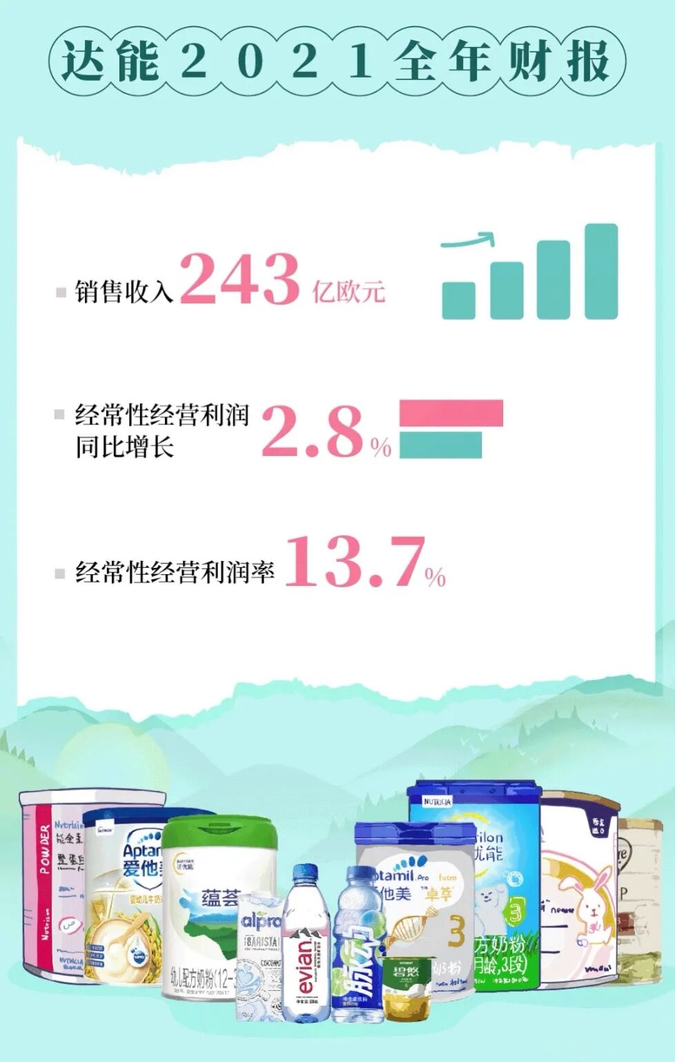 整体来看,财报显示,达能去年销售收入同比增长3.4%至243亿欧元,经常性经营利润同比增长2.8%至33亿欧元,经常性经营利润率为13.7%,同比微降9个基点。