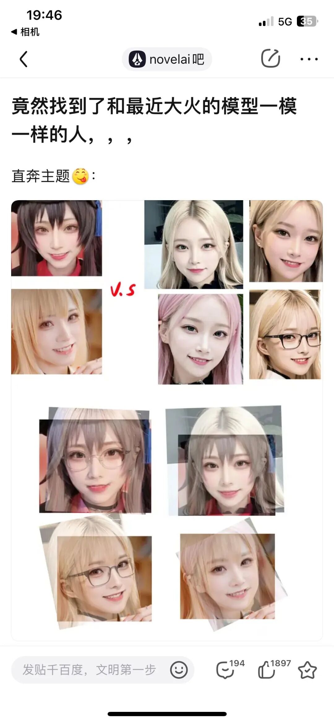 如果说画二次元还在纠结于画风这种知识产权问题,那么现在的三次元则明确到了“肖像权”的问题上,最近有一个帖子引起了人们注意,他表示自己在使用AI绘画时发现出图人物的脸型都差不多,便进行了比对,并且觉得这个脸型很像微博的一个博主。