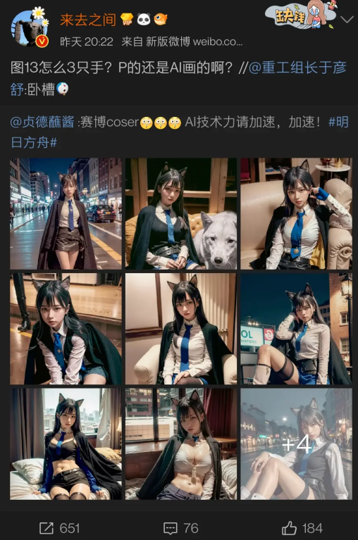 一些网友表示,这下“ai让人失业”的扩大面已经从小画家波及到了推特的福利姬了,有了赛博coser,谁还看真人coser,省去了拍摄过程,不用约场地,出图效率大大提高了,行业格局又该被打破了。