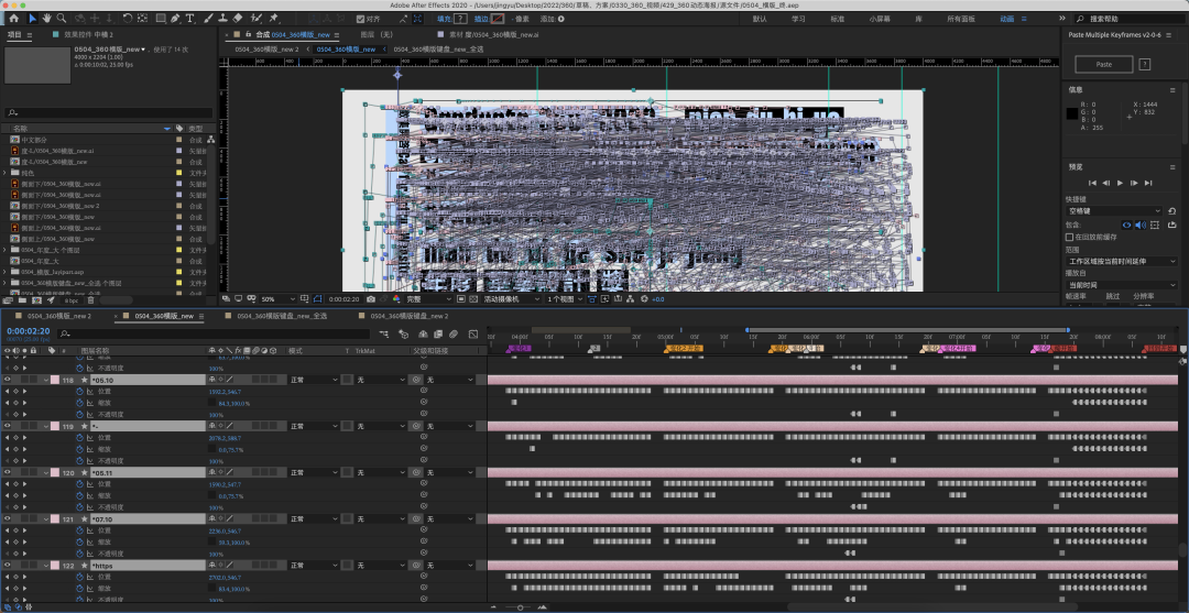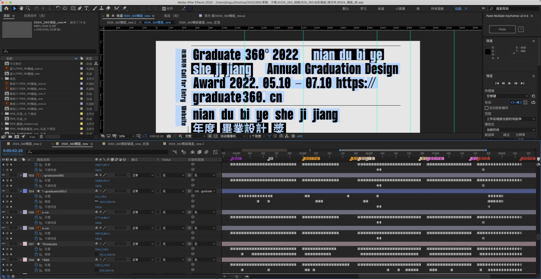 这次动态的所有工作都是在AE中一帧帧根据实际情况完成(两台电脑,一台AE制作动态,一台观察文本编辑器里文本伸缩变化)。工作室两位动态设计师用了一个周的时间分别制作了12秒的横版和竖版动态。