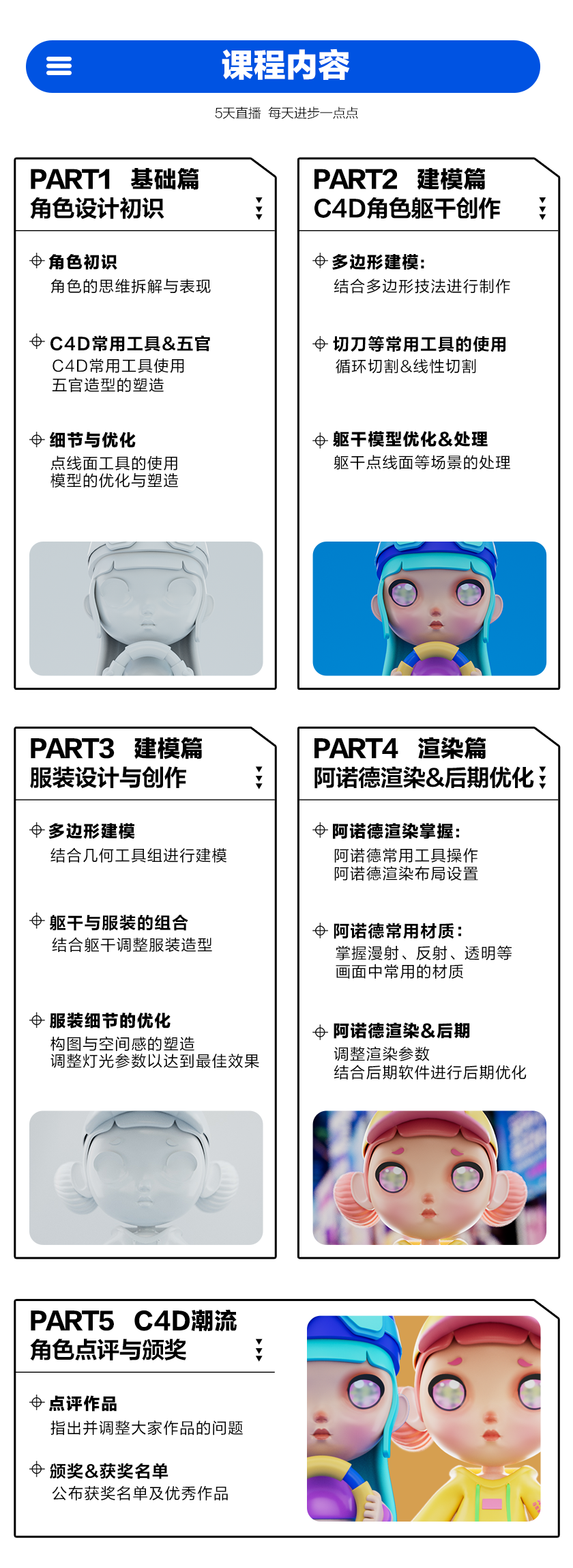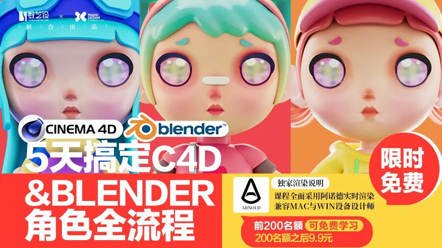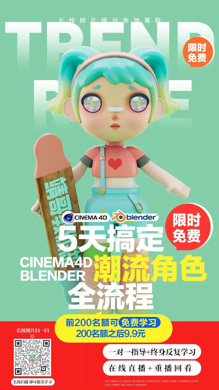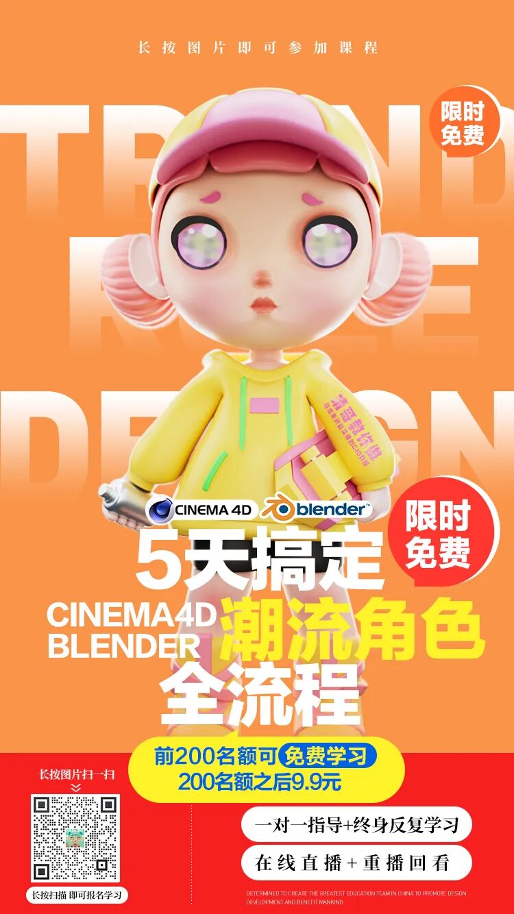 5天的课程内容,老师会从软件工具、建模技巧、渲染方法等几个方面带大家学习C4D&Blneder潮流角色设计,帮助大家解决C4D各种技法的问题,并大家完全掌握C4D潮流角色的创作。