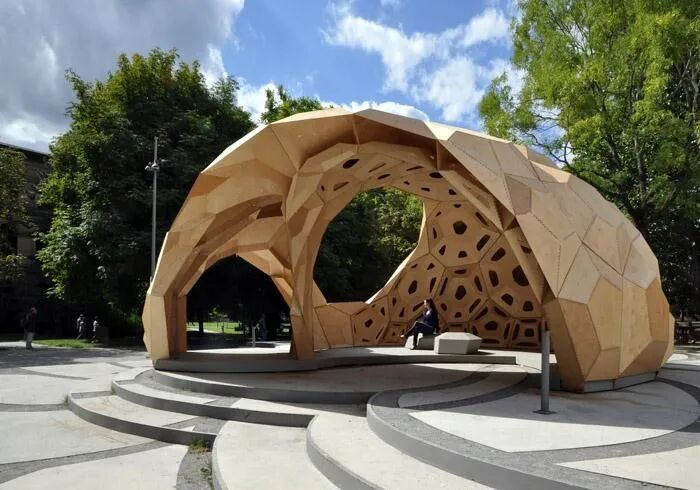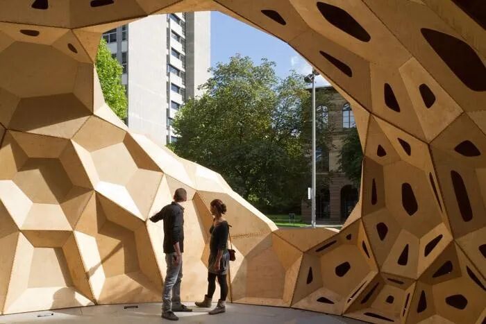 这是2011年夏季ICD,ITKE以及斯图加特大学学生共同完成的一个研究教学临时木材展馆。通过计算机设计探讨海胆的骨架,并让其转化为实际的建造,这是一个创新,拓展了仿生学与建筑的结合度。展馆的复杂形态由不同几何形状的极薄(6.5毫米)胶合板组成。