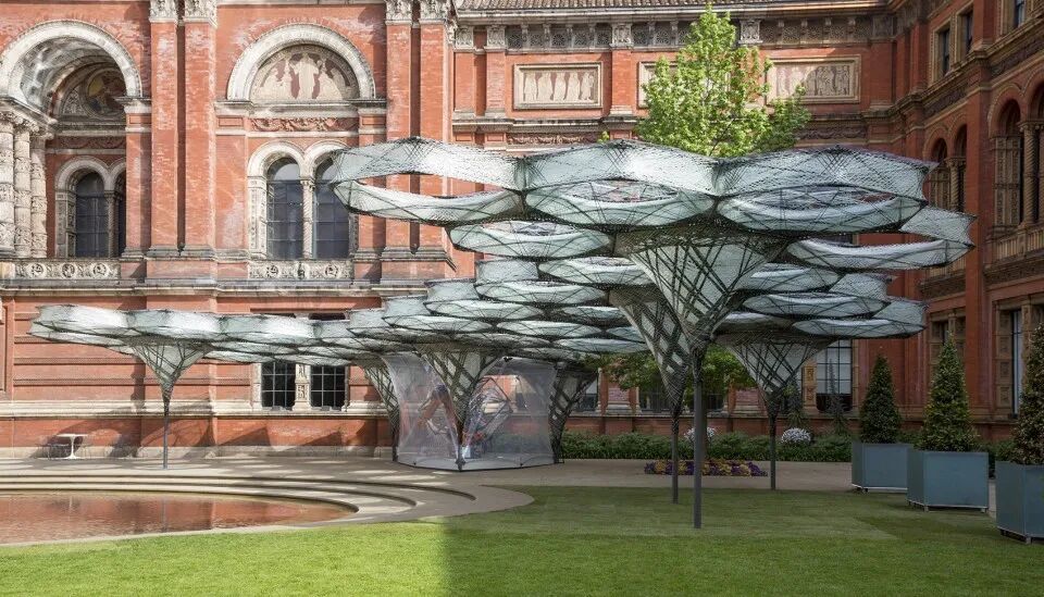 展厅Elytra占地约200平方米,装置位于伦敦V&A博物馆。设计团队着眼于自然,将甲虫前翅的轻质生物纤维结构转化为建筑结构,形成展厅单元轻盈而坚固的结构。