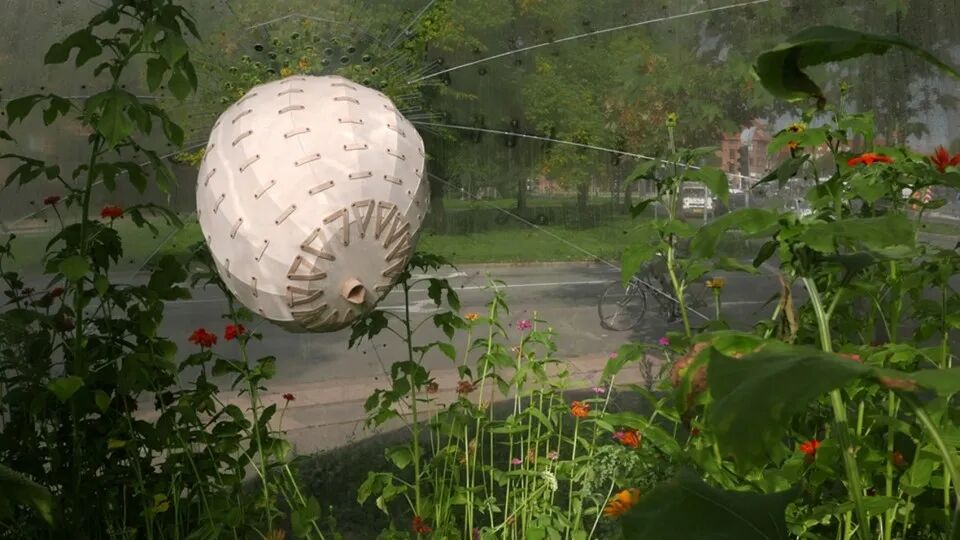 混凝土“碗”收集雨水,蒸发的雨水通过壳体上的小孔进入土壤。外壳和混凝土碗通过这种方式成为一个自给自足的温室。装置的土壤里播种了60种不同植物的种子,它们发芽长大后,大部分都能吸引昆虫。壳内还有一个蜂窝,蜜蜂可以直接进出。