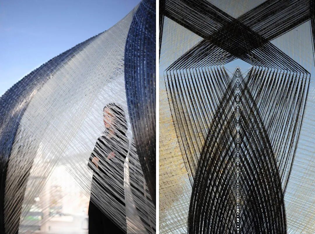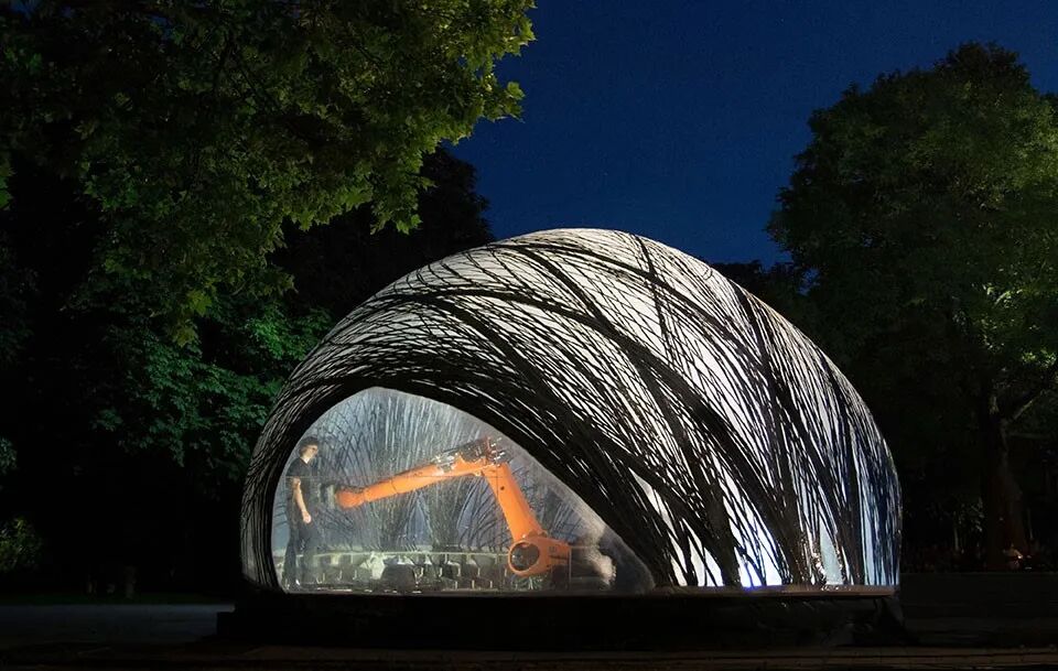 整个亭子是在一层柔软的薄膜,内部用机器人织上可以增强结构的碳纤维,形成了轻型纤维复合材料外壳构筑物,这种建造方式使用到最少的材料实现了结构稳定性。