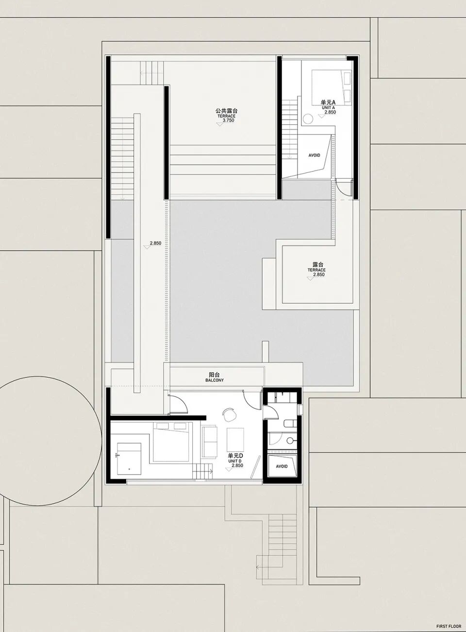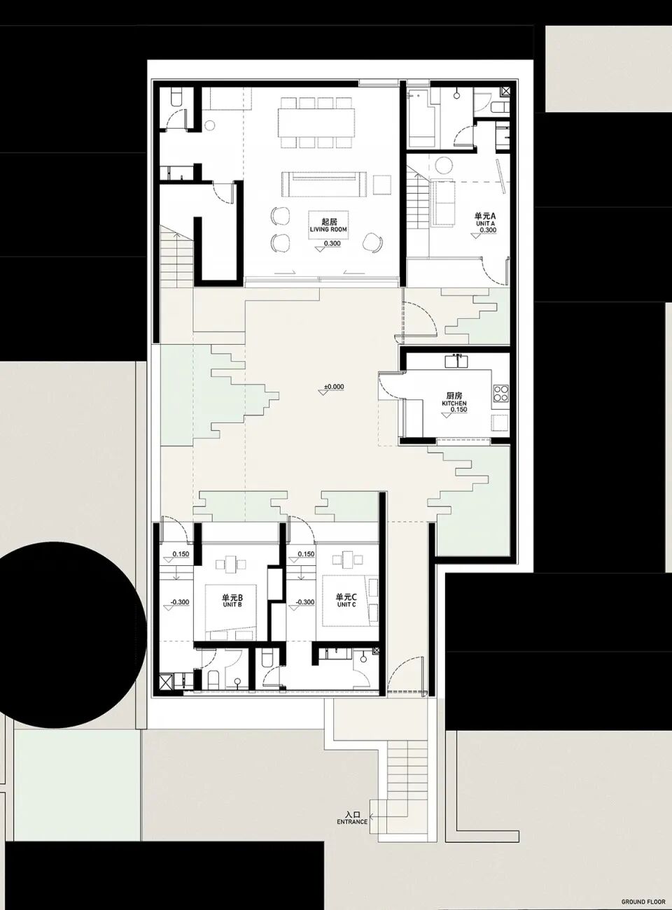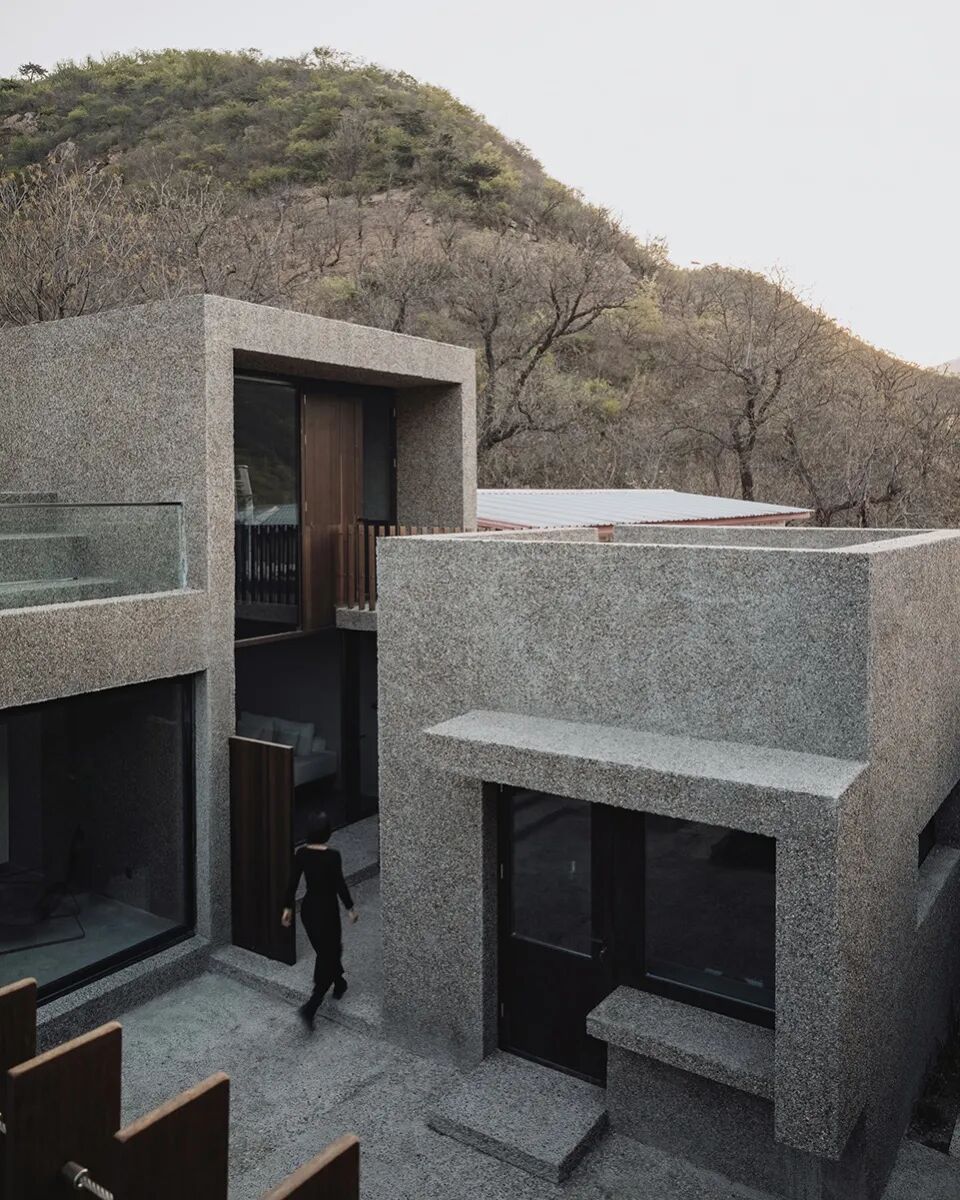 几何是关于空间的线、平面以及三维形体的定律。建筑依据地理形态,以几何的体块整体采用三段式平面布局,由北侧的起居、屋顶露台、拥有独立小院的Loft,中部的公共中庭、厨房,以及南侧三间客房构成。基于周遭杂乱的场地环境,外围封闭、向内生长成为设计的主要策略,既解决了住客的隐私性,也使围合的建筑实体进化为自我的内部环境。
