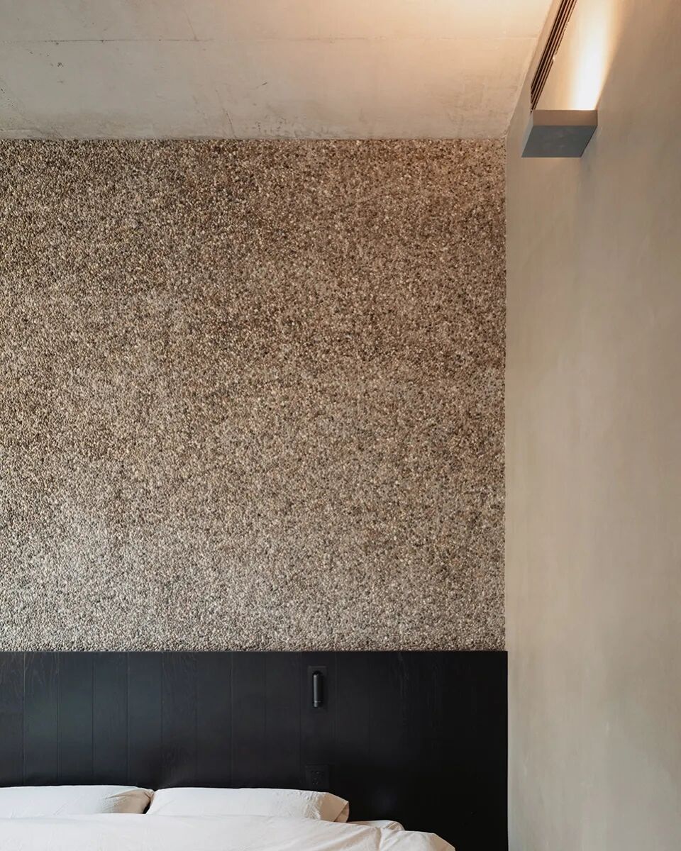 作为室内外主要的饰面用材,水刷石从鹞子峪古堡的建筑遗迹里浮现出来,过去常见的外墙材料而今被渐渐遗忘。这种久经岁月洗礼而历久弥新的材料,在我们看来,是重构场地历史和记忆的不二之选,并希望水刷石的运用能够令建筑融入于自然环境中去。这种看似简单便宜的材料,却需要工人一平方一平方的涂抹上墙和用水冲洗,也因为会用传统技艺的师傅越来越少,墙面的施工持续了三个月。好在最后呈现的效果令人满意。从室外到室内,从地面到墙体再到天花,一种材料表达了它可以表现的最大化,并强调了建筑向来不是特立独行的个体,它是与场地融为一体的、不突兀却有着独特性格和面貌的“芸芸众生”。