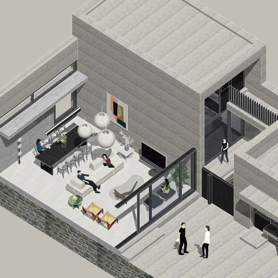 西侧邻居家院墙高筑,在适当的区域选择将我们的墙打开,避免两堵实墙带来完全封闭和笨重的即视感,直接将邻院的墙作为我们的景,这种巧妙的顺势而为,我们称之为他借;而所有室内空间则以庭院作为主要景观面,强调庭院在建筑中的重要性,同时积极地鼓励住客于此互动、聚集和分享,这种“以自我为中心”的建造方式,我们称之为自取。