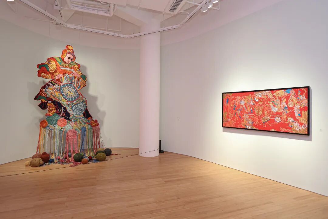 Jacky Tsai同样对传统文化,尤其是中国的传统艺术与古老工艺着迷,这体现了其挑战波普艺术之边界的决心——Jacky Tsai认为,潜藏在人们意识深处的对自我身份及文化根深蒂固的认知,恰恰是最具波谱烙印的所在。不论是西方的版画、丙烯、装置,抑或中国传统的苏绣、木板漆雕、彩瓷,都在Jacky Tsai手中融为和谐的一体,也突破了在西方语境构筑的艺术史正典中对波普艺术之定义的桎梏。此次展览中呈现有多件展现中国传统工艺的作品,如将自然山水、植物与人的生活日常巧妙置于同一空间的青花瓷作品《荷戏》、以苏绣呈现的古罗马女神《维纳斯》,以及一件以艺术家自身形象出现的藏毯织物——在《孤独的编制者》中,由传统工艺编制而成的艺术家正埋头编织着作品本身,构成一件循环往复,逸趣横生的画中画。