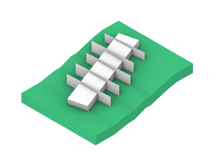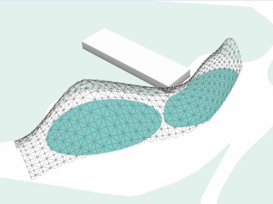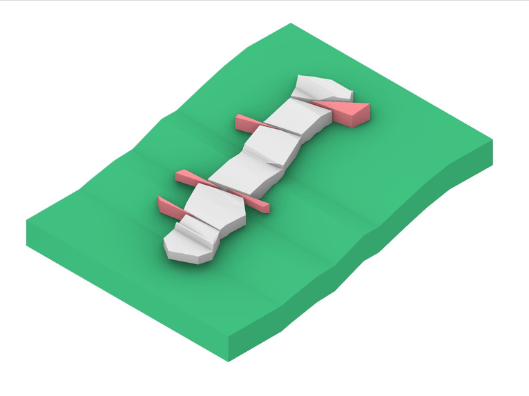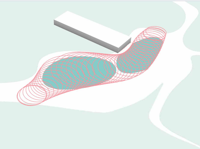下一步就是要决定建筑的空间形态,让这个建筑支棱起来。这时候就轮到了建筑师登场。仔细研究过地形跟基地范围后,建筑师认为照搬之前的生成方式肯定是行不通的,既然一期博物馆的单间小房子做不成了,那么就给恐龙蛋它们做个连通的大房子吧。