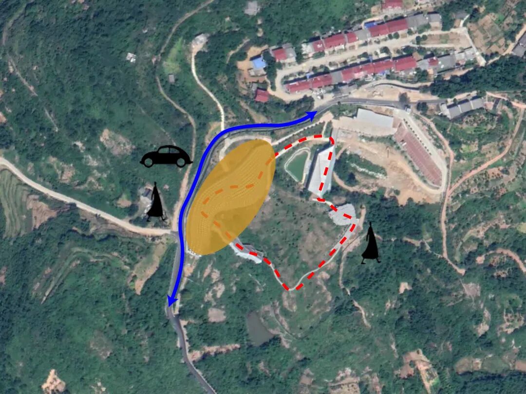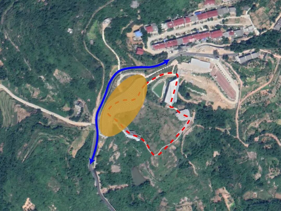青龙山,位于湖北省十堰市郧阳区,周围星罗棋布着大大小小的村落,生态环境优良,一眼望去,可谓是青山绿水环抱的原生态基地,不愧是恐龙选中的产蛋圣地。场地是70多米长,存在15 米高差的起伏的山地地形,该如何完成这个设计,实在是个挑战。