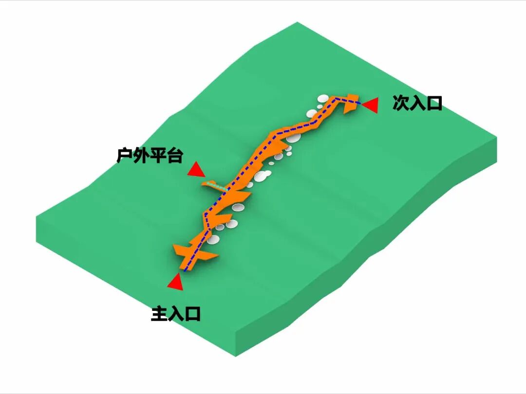 作为环形步道的一部分,显然,建筑的东北端与东南端连接一期博物馆处,都可以成为建筑的主入口,对入口的选择主要依赖于参观者是希望先参观恐龙蛋再了解详细知识,亦或者反之先熟悉了背景知识再参观恐龙蛋。